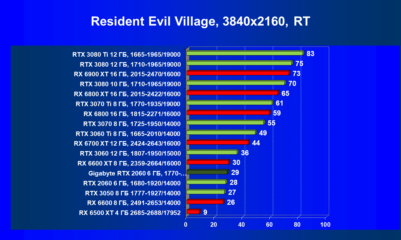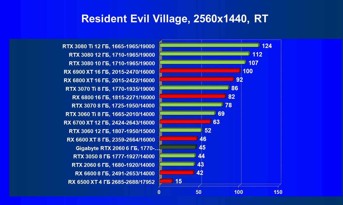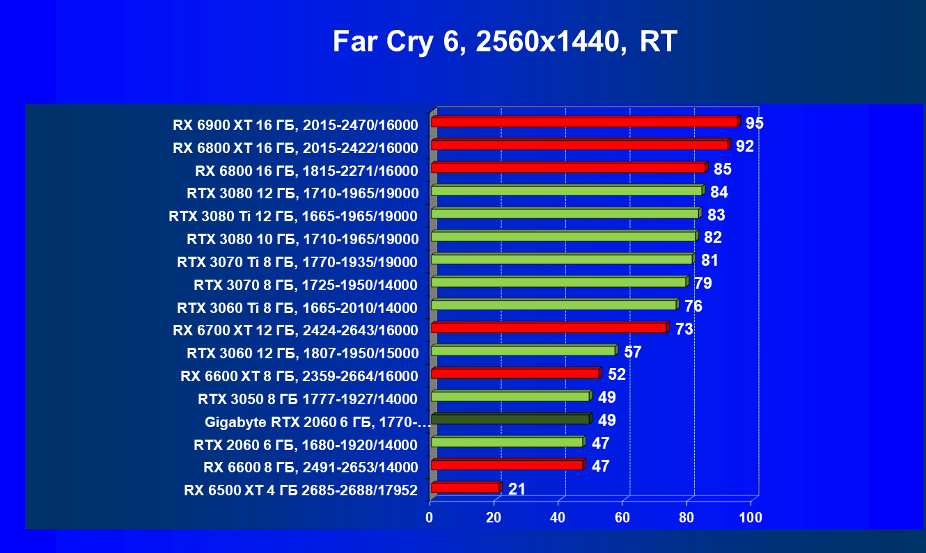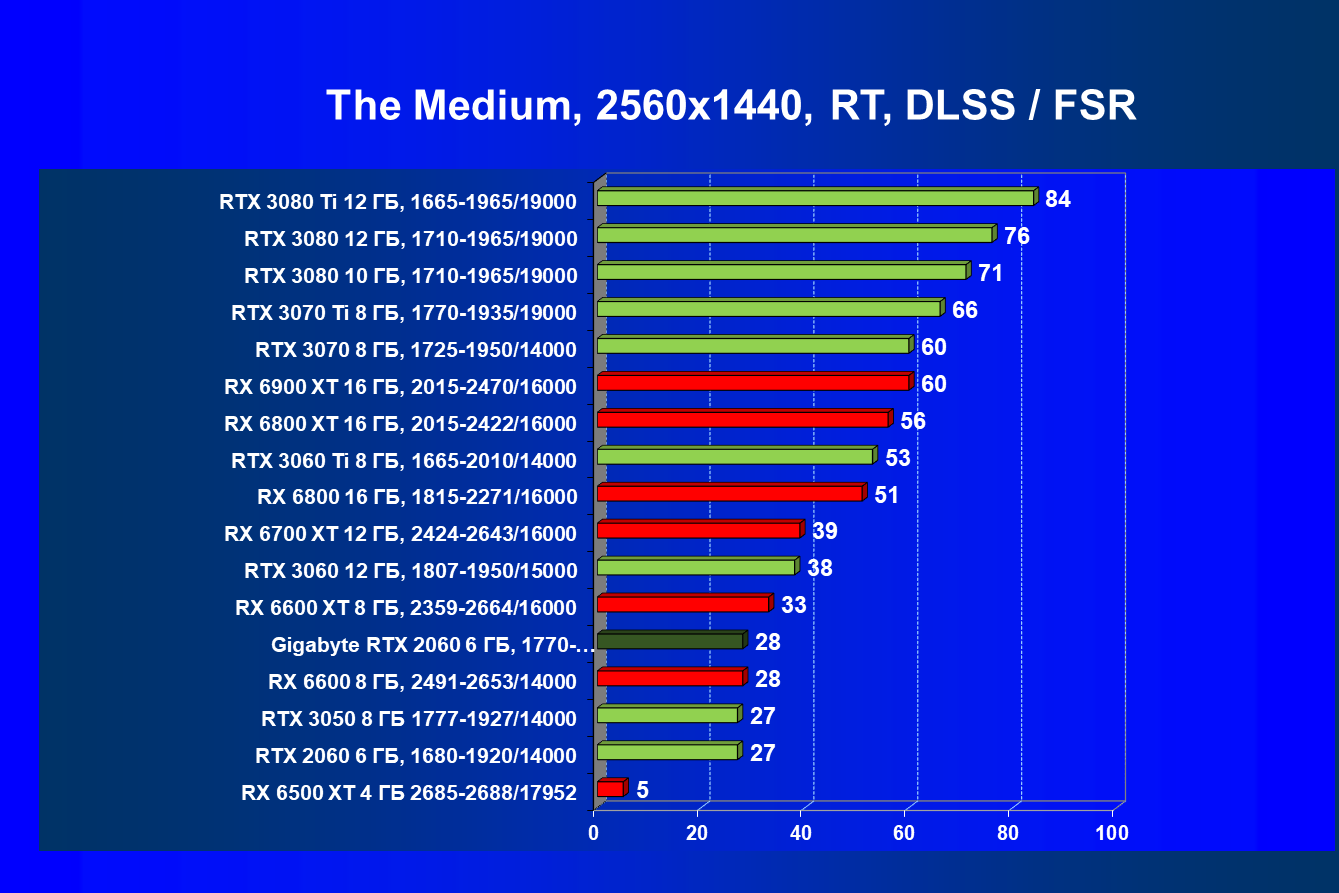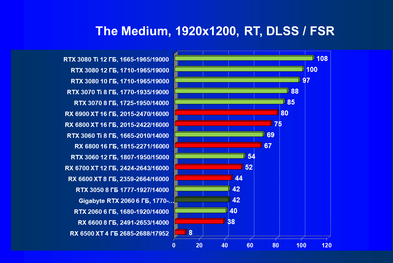 Хотя ускоритель GeForce RTX 2060 вышел в начале 2019 года, он по-прежнему сохраняет актуальность. В разрешении Full HD даже на ультра-настройках графики производительность приемлемая, обеспечивается возможность играть с трассировкой лучей и DLSS. Производительность в играх с трассировкой лучей у GeForce RTX 3050 и GeForce RTX 2060 довольно близка, однако на момент подготовки обзора приобрести GeForce RTX 3050 уже можно было чуть дешевле. А вот у Radeon RX 6500 XT включать трассировку лучей не рекомендуется, потому что провал в производительности огромный, даже несмотря на частичную компенсацию за счет FSR. Даже модель Radeon RX 6600, без включения RT более производительная, чем GeForce RTX 2060/3050, с трассировкой лучей уступает им.