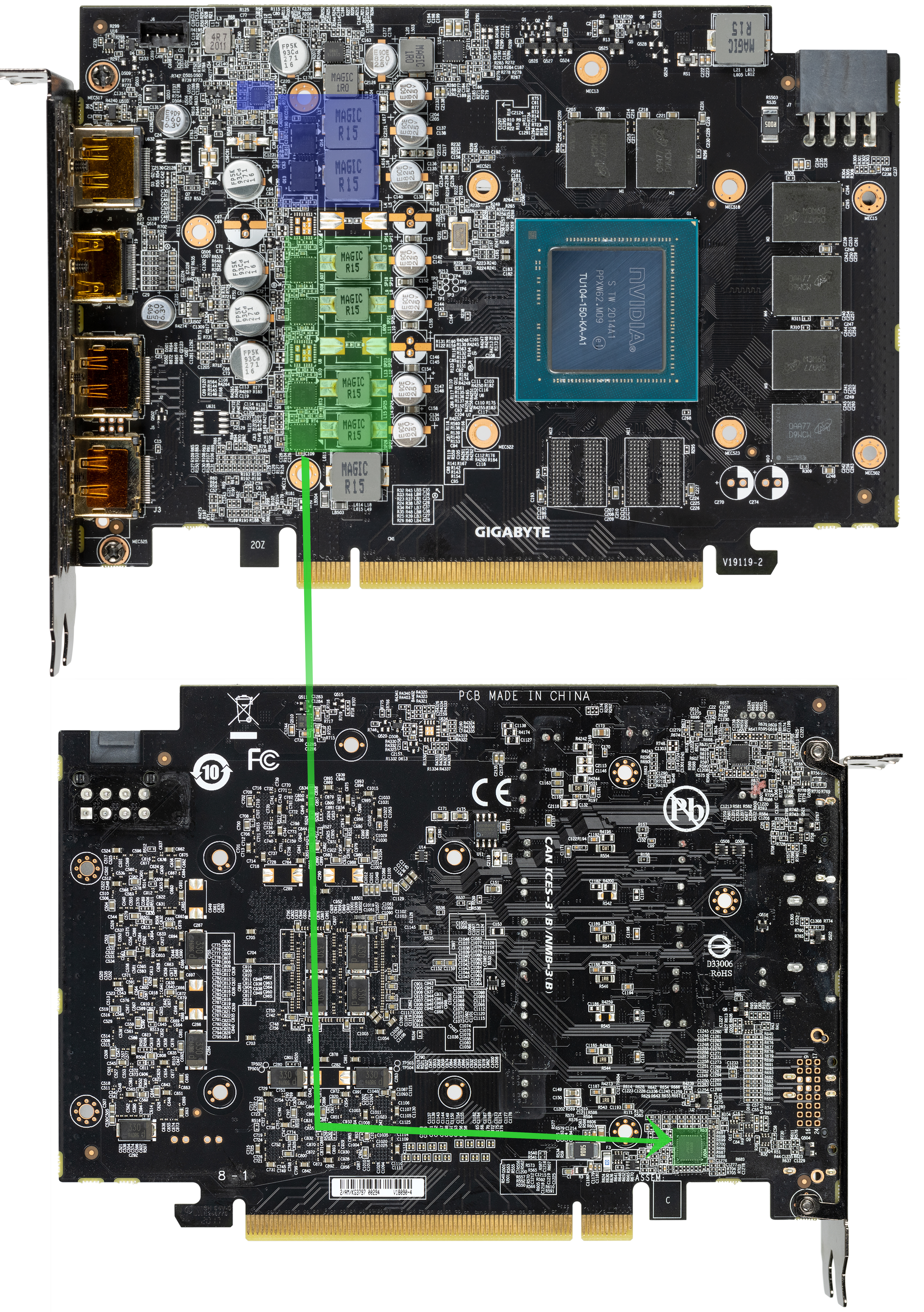 Зеленым цветом отмечена схема питания ядра (4 фазы), синим — памяти (2 фазы). Для управления питанием GPU используется ШИМ-контроллер uP9512R (uPI Semiconductor), который расположен на лицевой стороне платы.