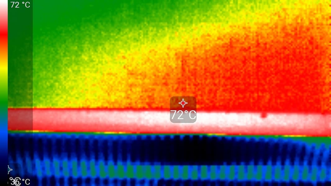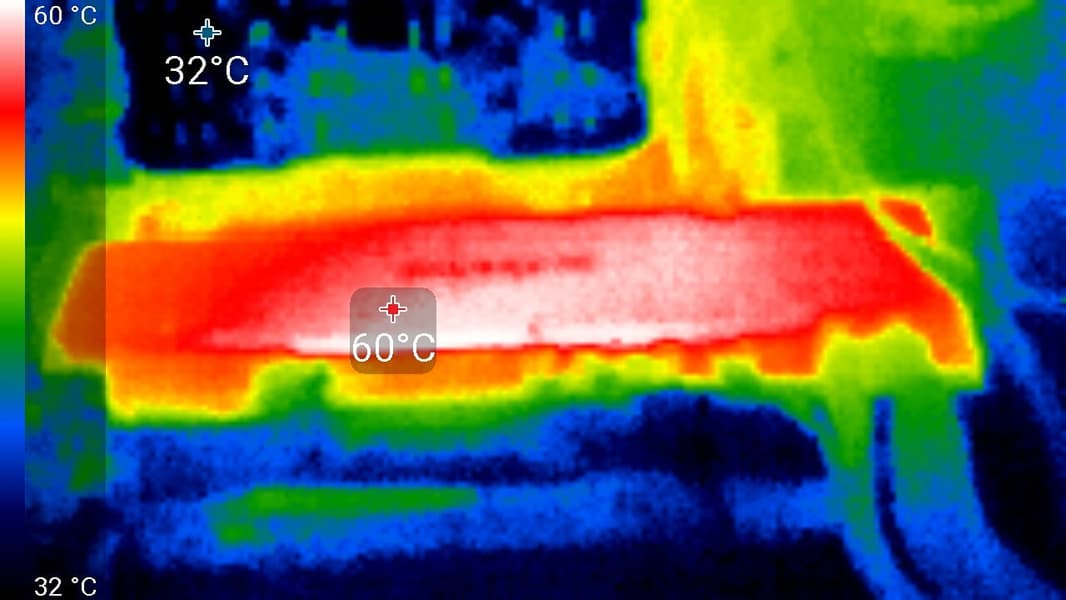 Максимальный нагрев — верхний край оборотной стороны PCB.