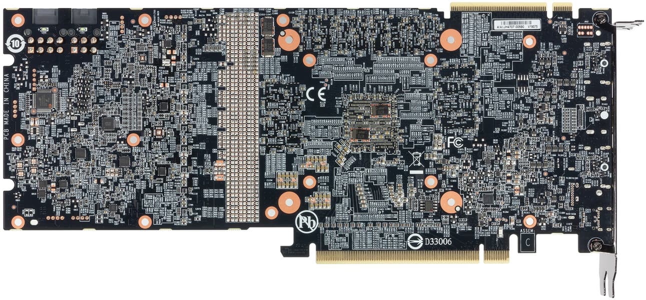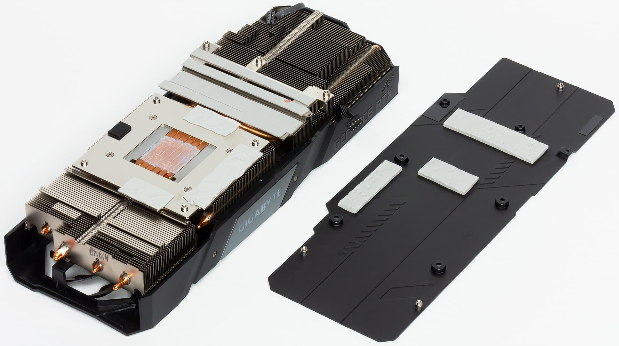 Перед нами традиционный кулер серии Windforce, представляющий собой трехсекционный радиатор с пластинчатыми ребрами, все части которого пронизаны тепловыми трубками, прижимающимися напрямую к микросхеме GPU. На подошве основного радиатора имеется термоинтерфейс для охлаждения микросхем памяти. К силовым элементам конвертера питания прижимается подошва на второй части радиатора. На обороте карты установлена толстая пластина, служащая не только элементом жесткости, но и охладителем PCB.