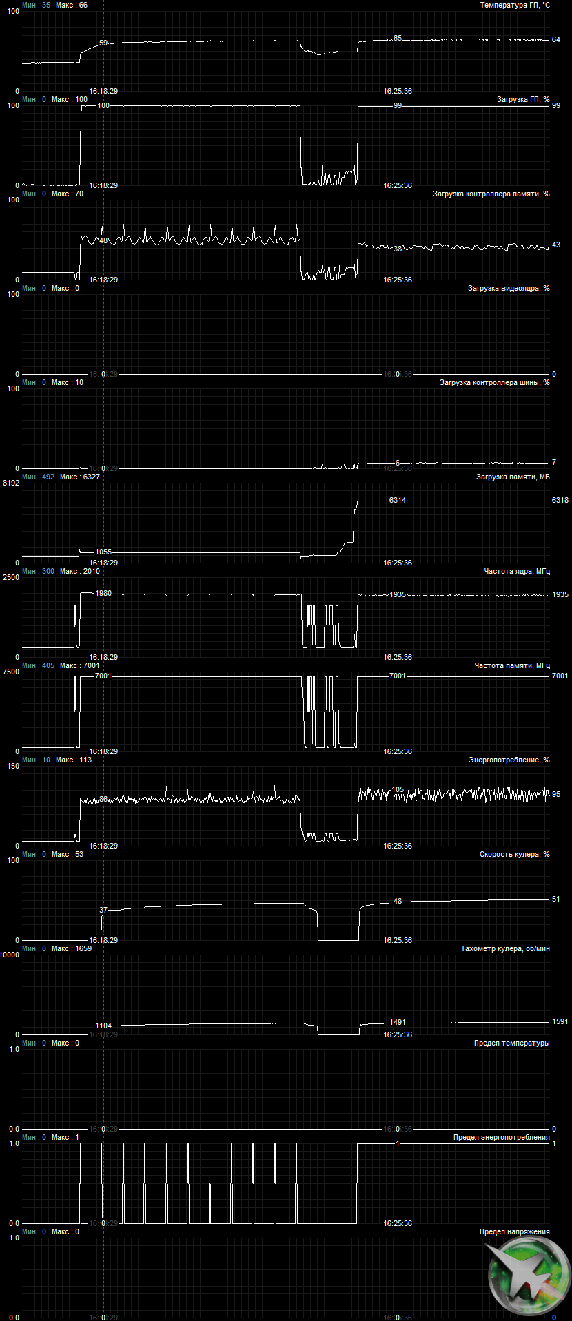 После 6-часового прогона под нагрузкой максимальная температура ядра не превысила 65 градусов, что является отличным результатом для видеокарты такого уровня.