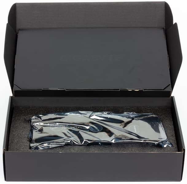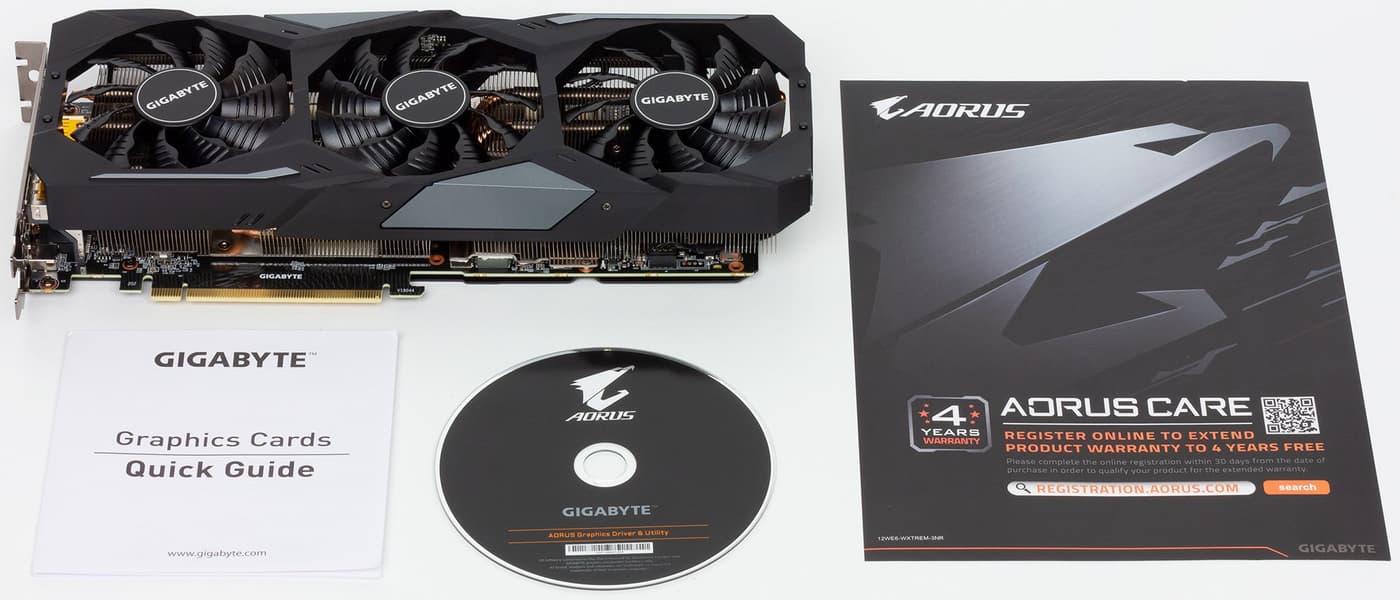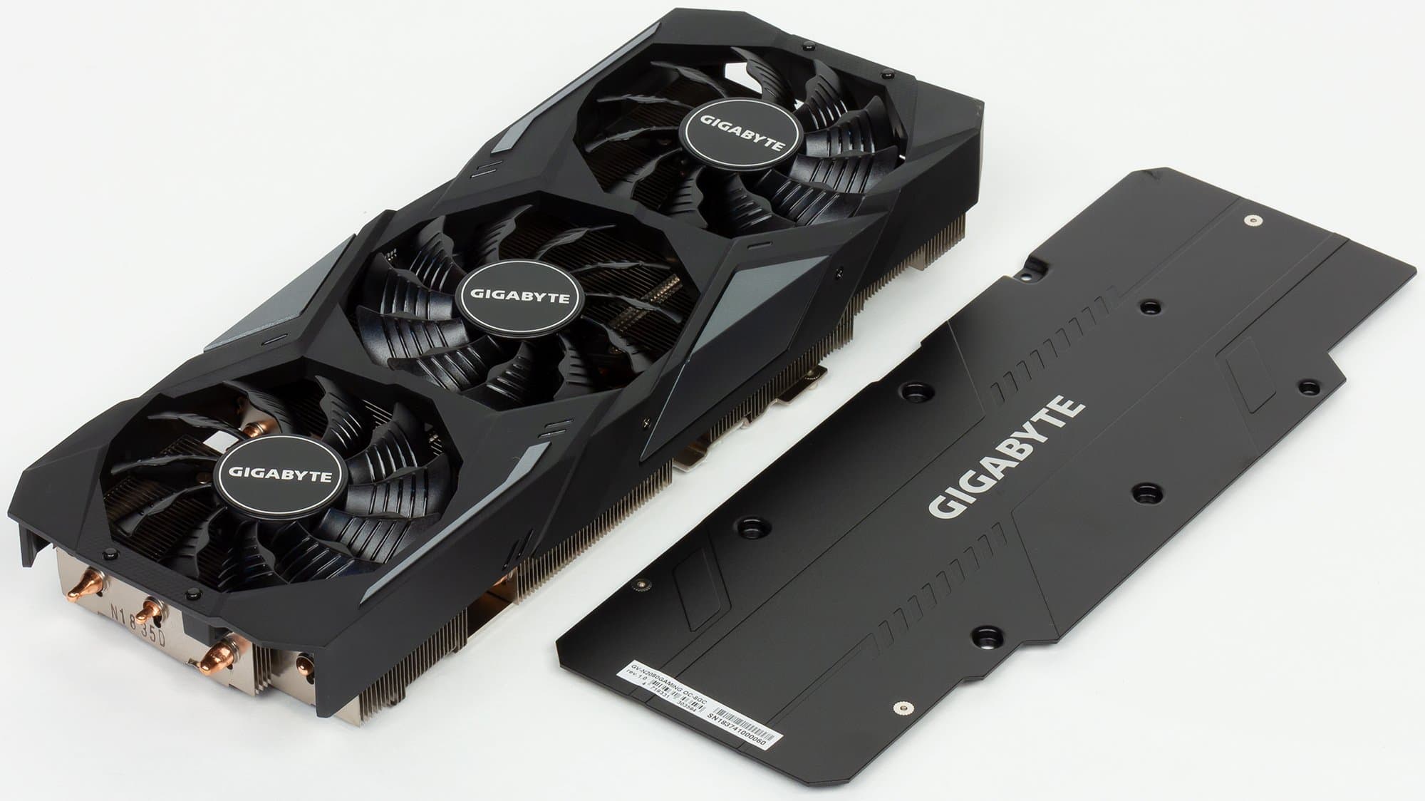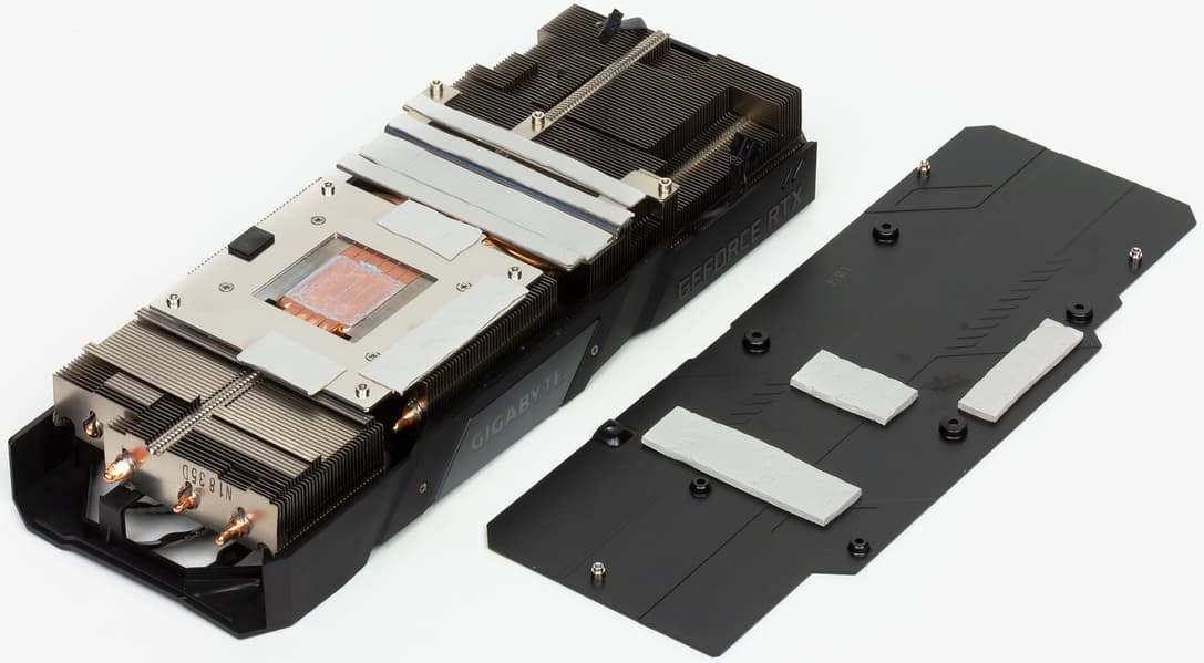 Главной частью кулера являются три массивных пластинчатых никелированных радиатора, соединенные между собой тепловыми трубками, впрессованными в основание, которые обеспечивают равномерное распределение тепла по ребрам радиаторов. Поверх радиаторов установлен кожух с тремя вентиляторами, работающими на одинаковой частоте вращения. У этих вентиляторов (Gigabyte называет их Stack Fan) не только особый профиль лопаток, они еще и расположены в разных плоскостях, при этом средний вентилятор вращается в противоположном направлении (получается эффект «шестеренок»). По словам производителя, это позволяет резко увеличить КПД охлаждения радиаторов. Следует также напомнить, что кулеры этой серии останавливают вентиляторы в случае простоя или малой нагрузки (если температура GPU не выше 50-55 градусов). Поэтому не стоит пугаться, если при запуске ПК вентиляторы на ускорителе не вращаются. Кстати, индикатор на торце кулера информирует о том, вращаются ли вентиляторы. Микросхемы памяти охлаждаются основной пластиной вместе с ядром (она сделана из медного сплава), а силовые транзисторы охлаждаются отдельной пластиной, прикрученной ко второму радиатору. На обороте видеокарты установлена толстая пластина, которая обеспечивает жесткость относительно массивной видеокарты (предотвращая изгиб печатной платы), а также служит дополнительным радиатором для PCB (она прижата к текстолиту через термоинтерфейс). СО оснащена подсветкой, цветом которой можно управлять с помощью утилиты Aorus Engine.