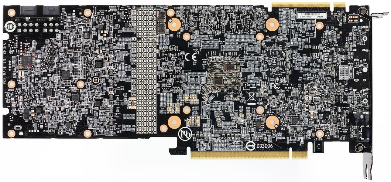 Как и у карты Nvidia Founder’s Edition, схема питания построена на базе 8-фазного цифрового преобразователя iMon DrMOS. Эта динамическая система управления питанием способна осуществлять мониторинг тока чаще раза в миллисекунду, что дает жесткий контроль над поступающим на ядро питанием. Схема питания управляется цифровым контроллером uP9512P производства uPI.