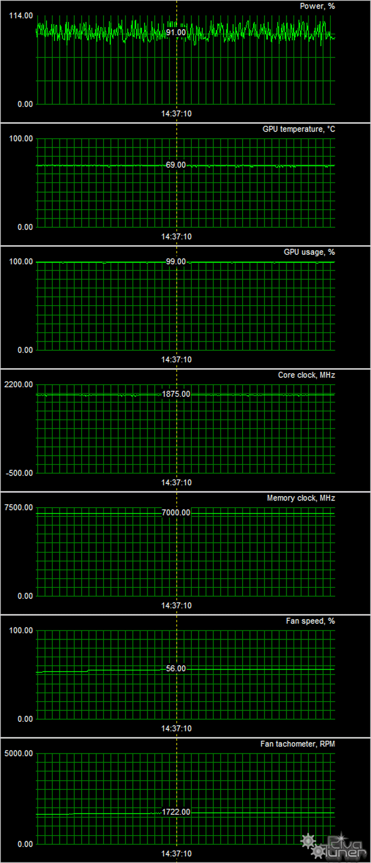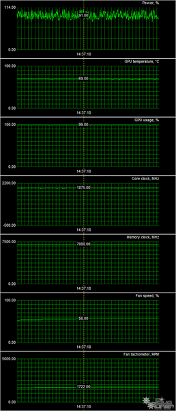 После 6-часового прогона под нагрузкой максимальная температура ядра не превысила 69 градусов, что является отличным результатом для видеокарты такого уровня.