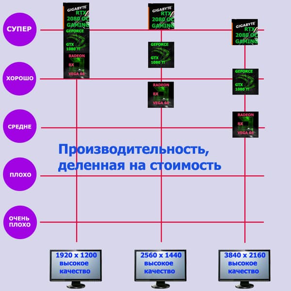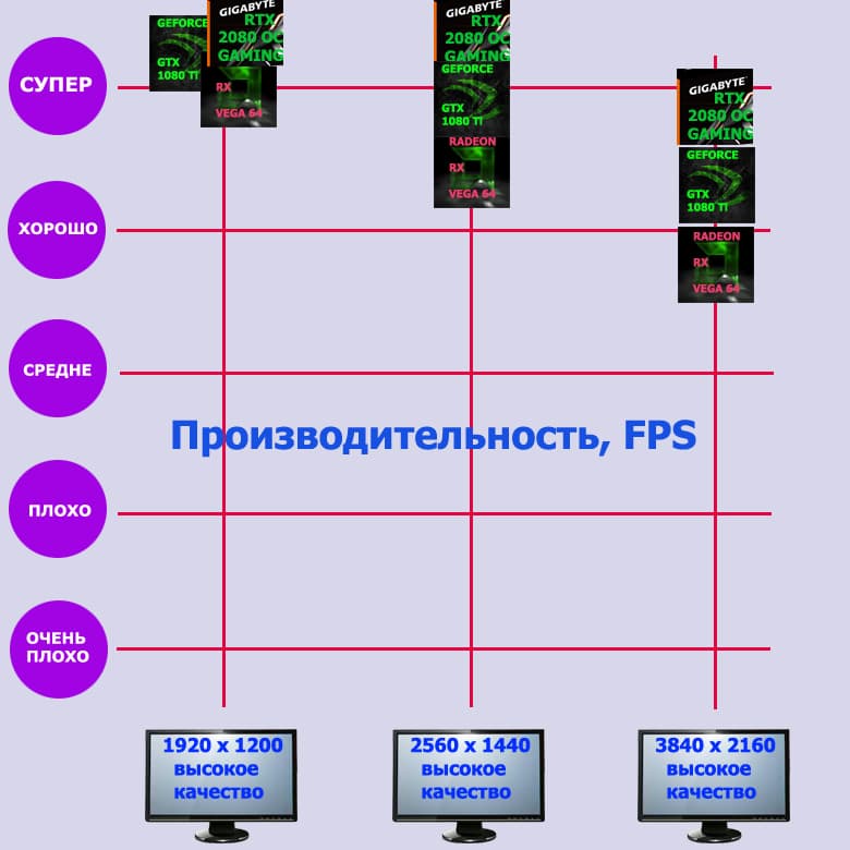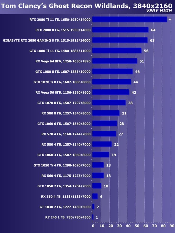 Эта карта Gigabyte прекрасно подойдет, если вы хотите играть на максимальном качестве графики во всех играх в разрешении до 2560×1440 включительно. На тех же максимальных настройках графики в разрешении 4К этот ускоритель также выдаст хорошую производительность в большинстве игр. Следом идет GTX 1080 Ti, а RX Vega 64 на третьем месте.