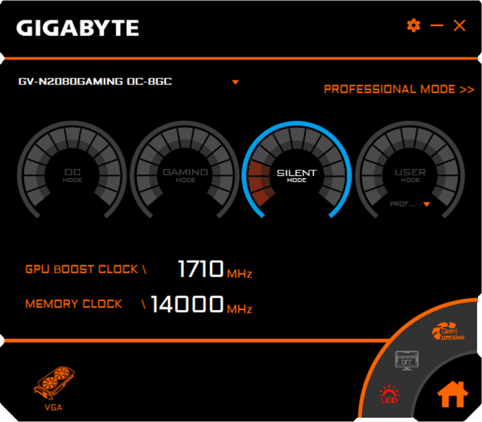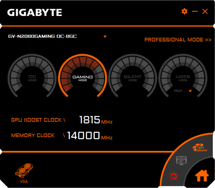 Смена режимов работы карты, а также ручное выставление частот обеспечиваются с помощью фирменной утилиты Gigabyte, которую можно скачать с сайта производителя.