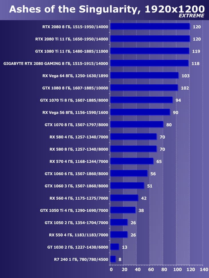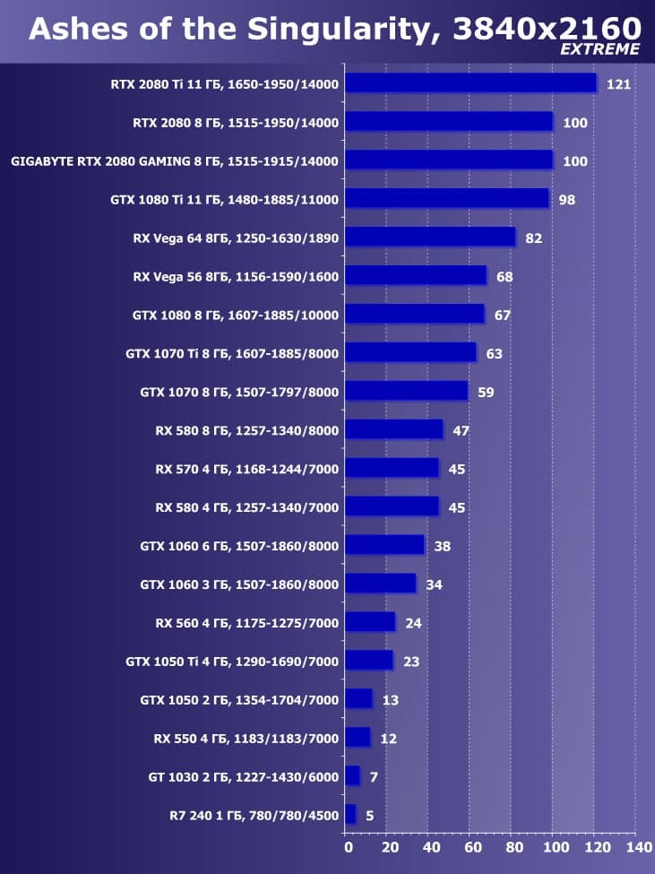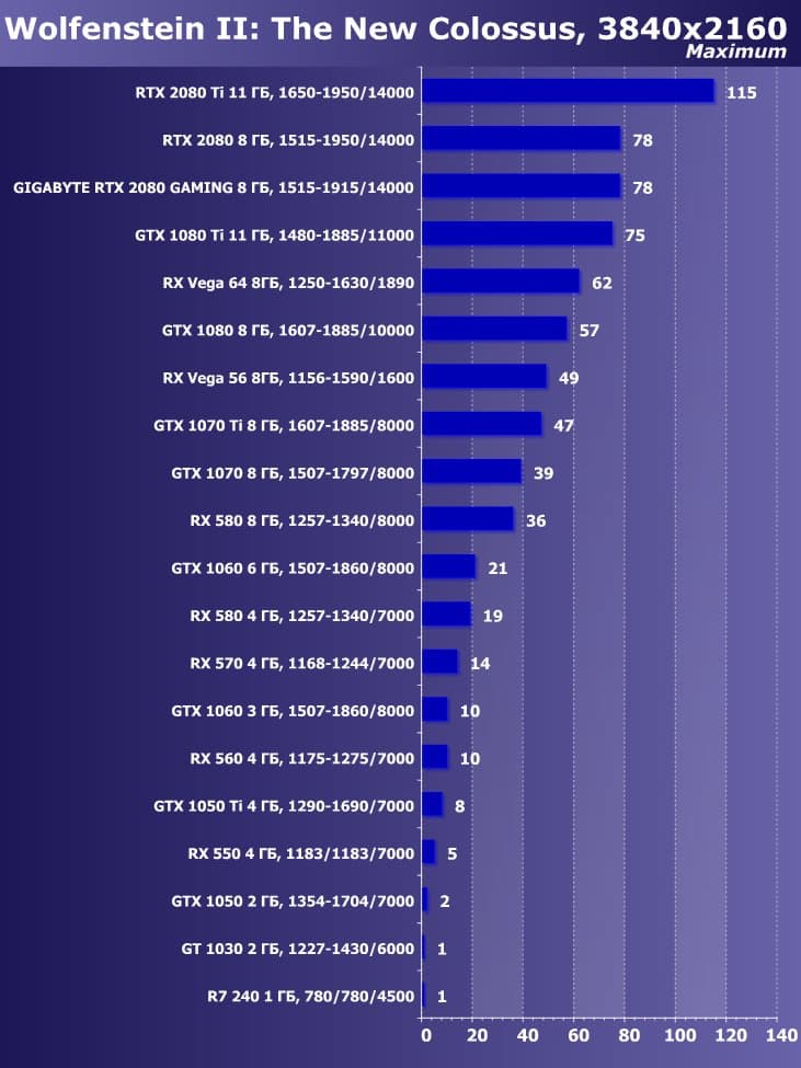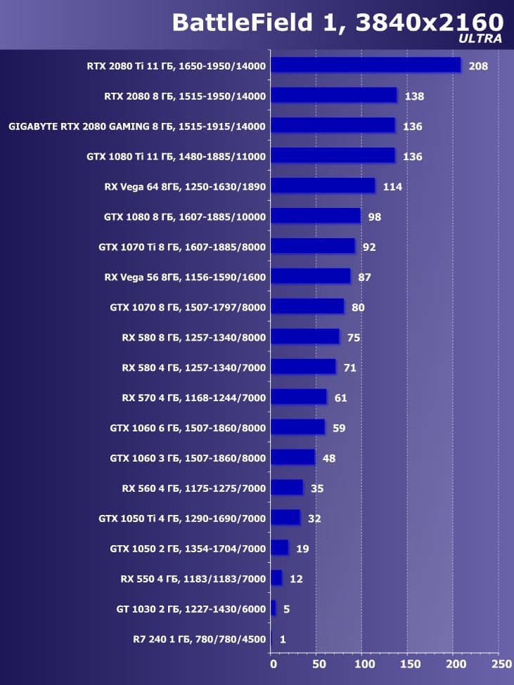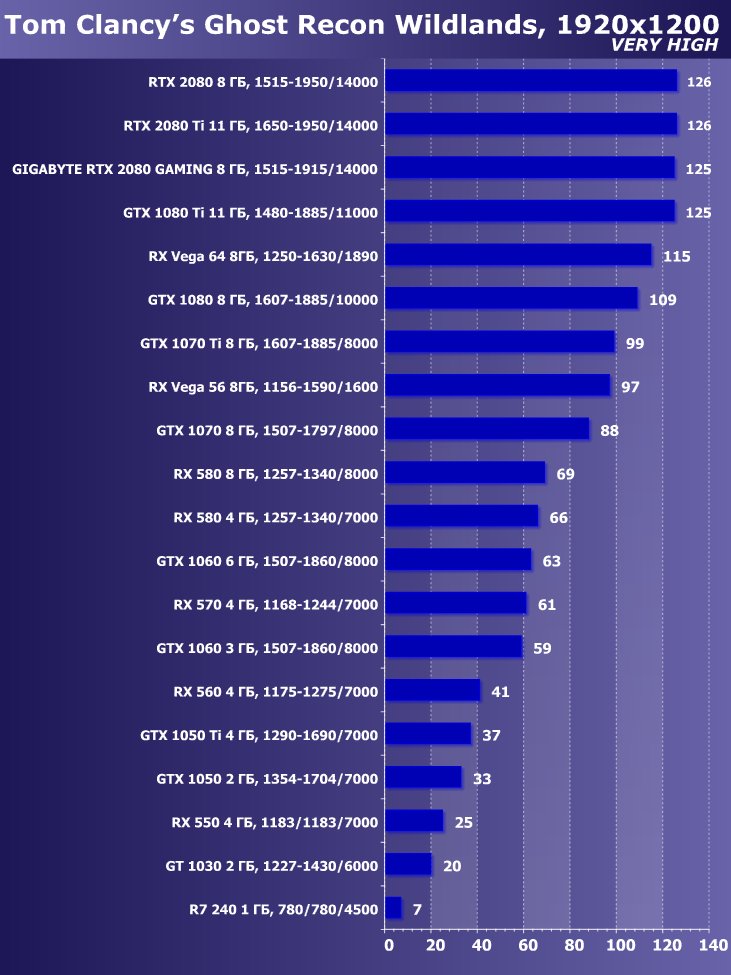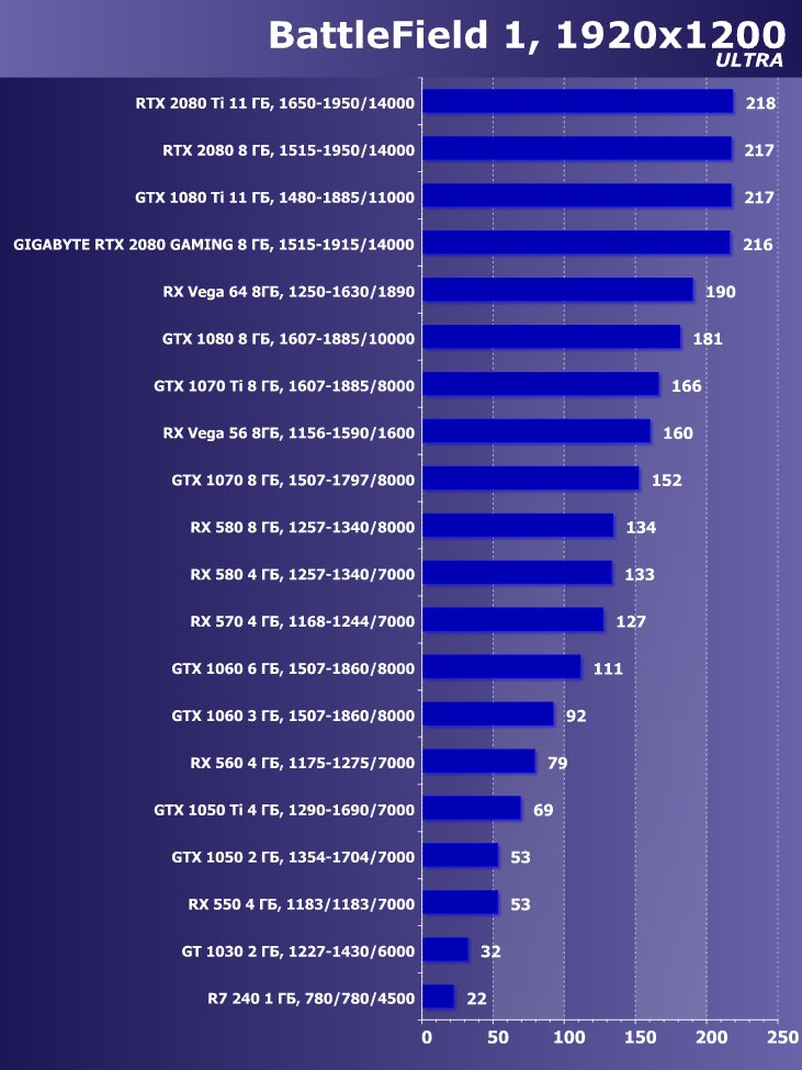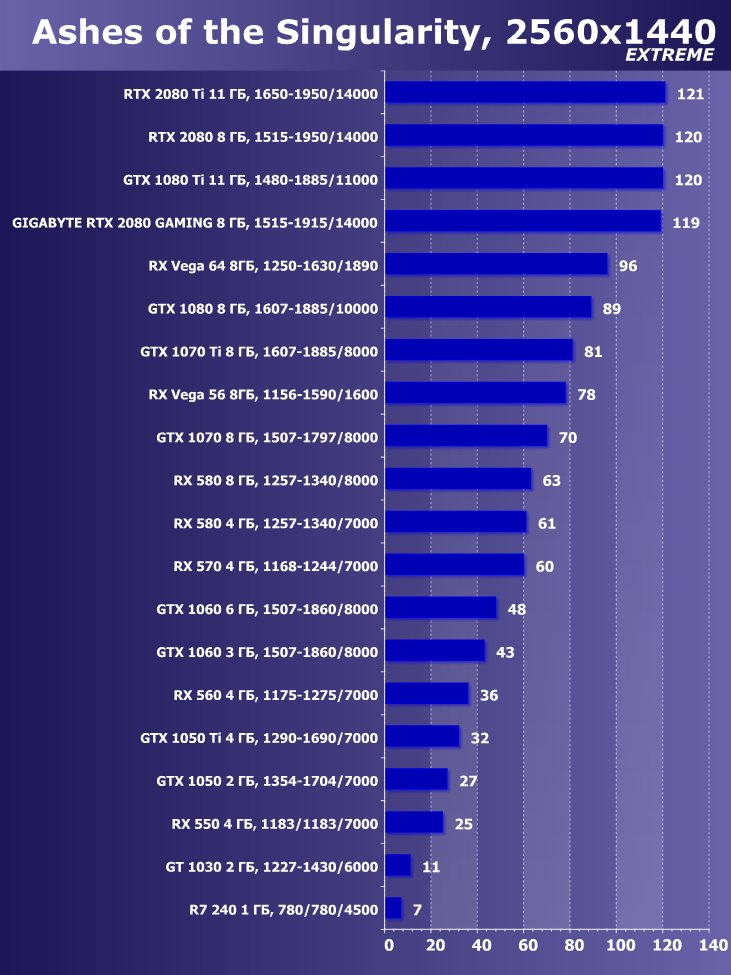 | 11 | Gigabyte RTX 2080 Gaming OC 8 ГБ, 1515—1915/14000 | 774 | 4580 | 59 200 |