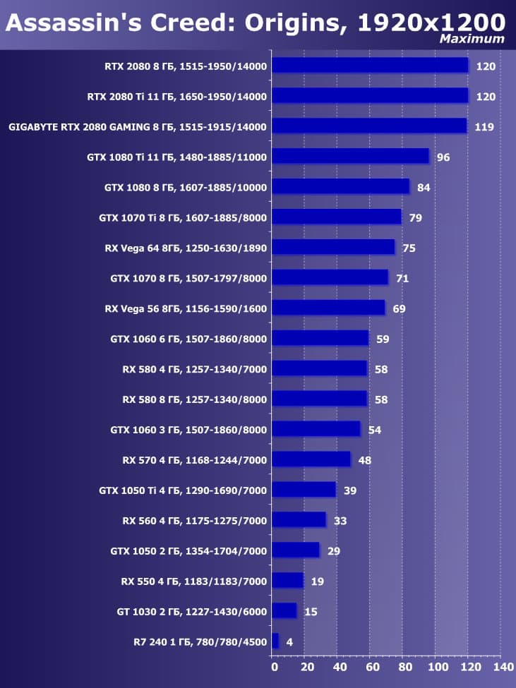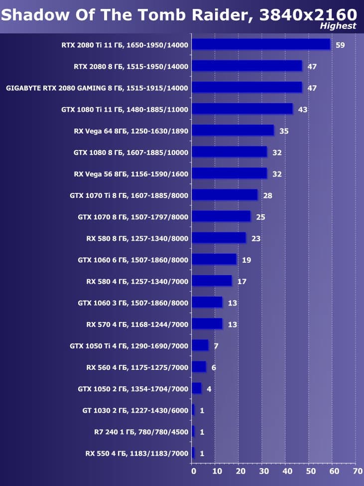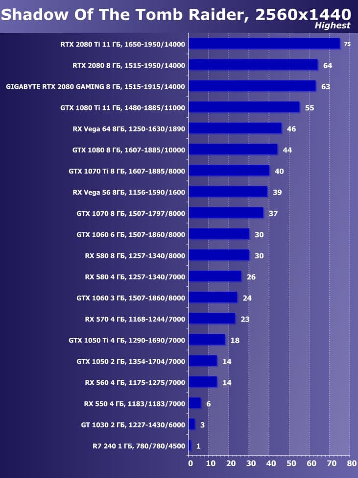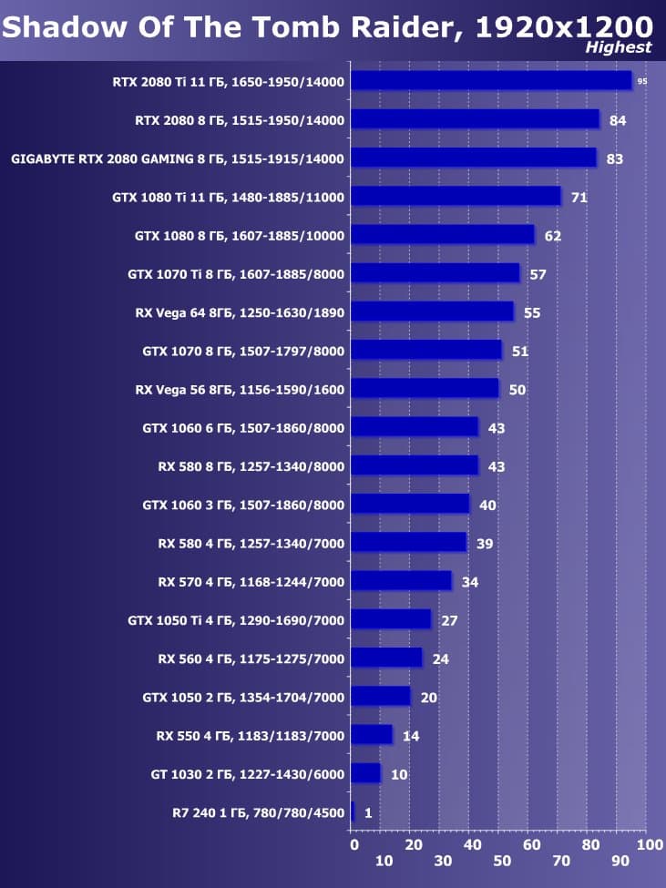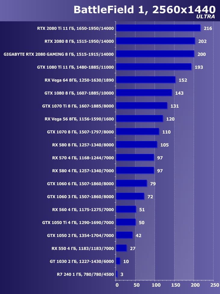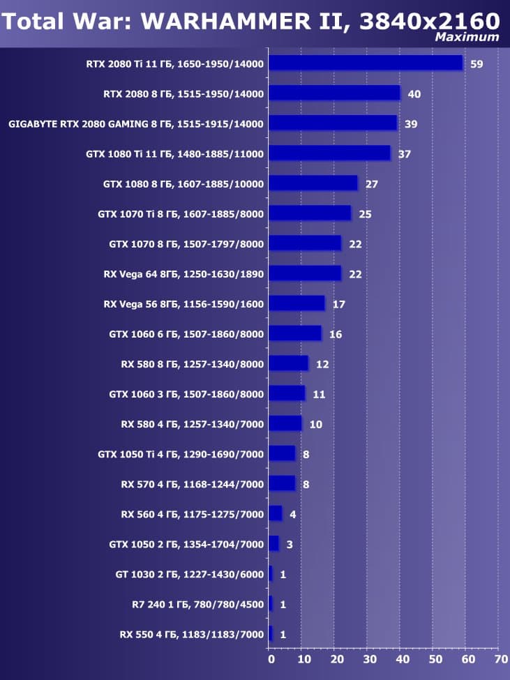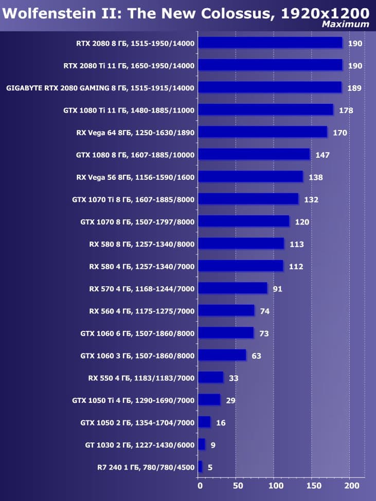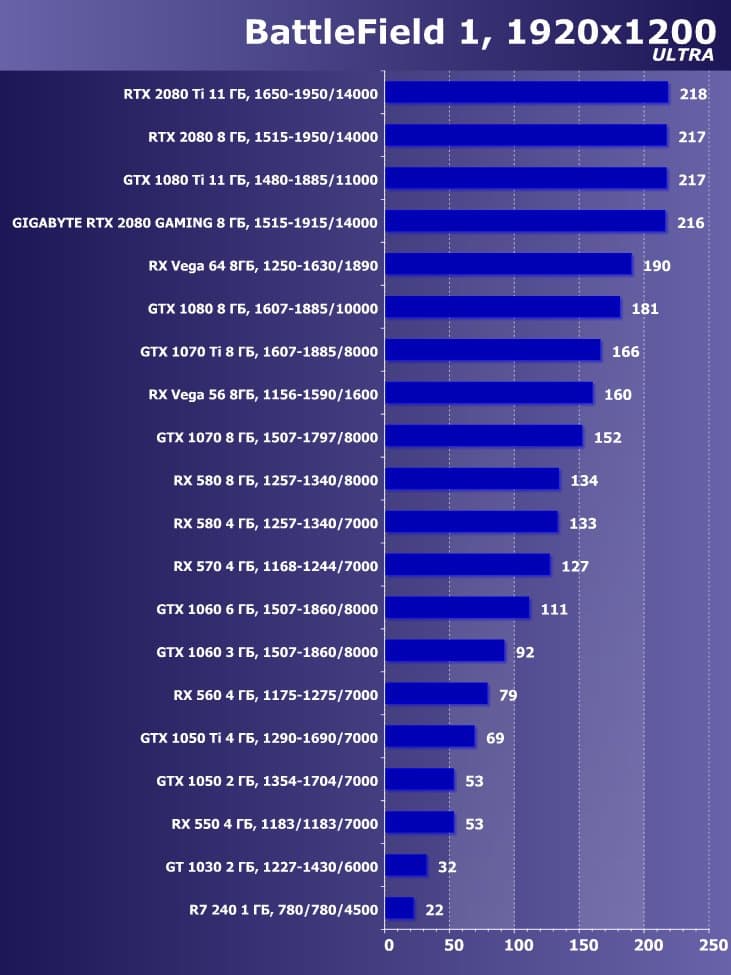 | 11 | Gigabyte RTX 2080 Gaming OC 8 ГБ, 1515—1915/14000 | 774 | 4580 | 59 200 |