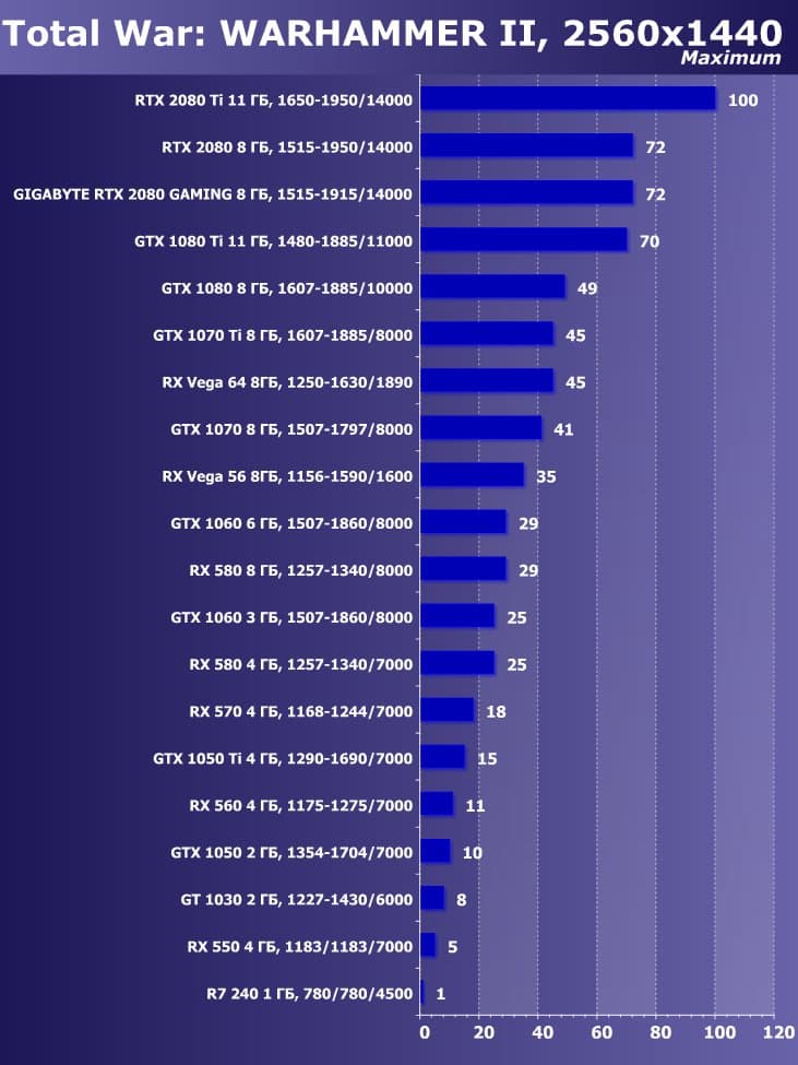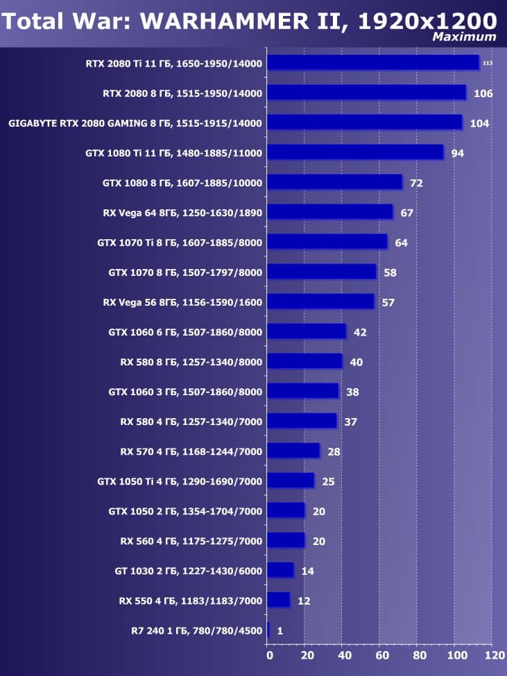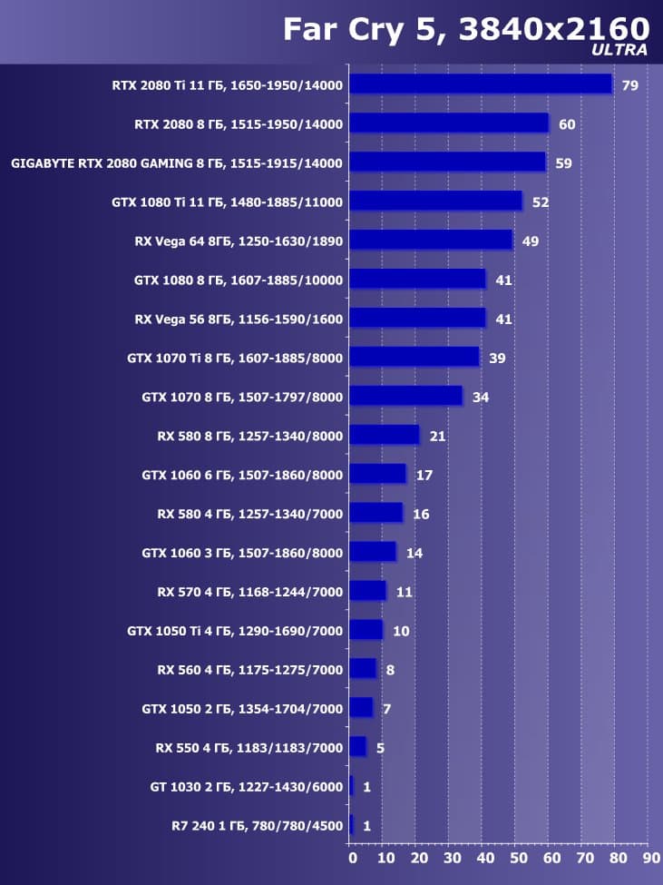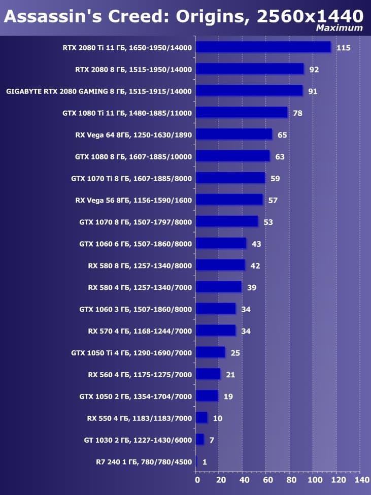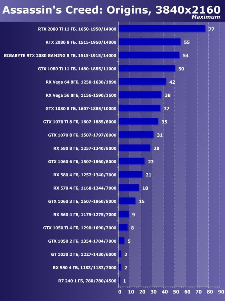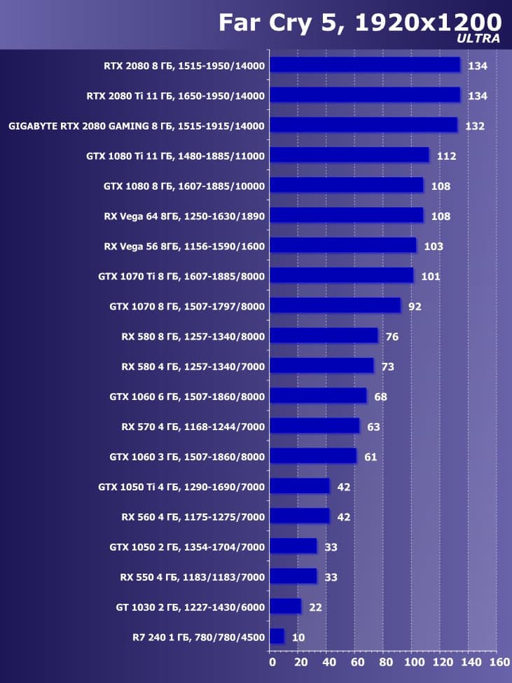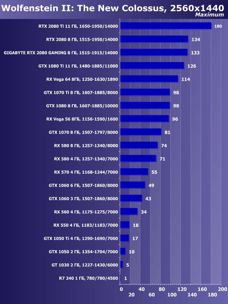 | 11 | Gigabyte RTX 2080 Gaming OC 8 ГБ, 1515—1915/14000 | 774 | 4580 | 59 200 |