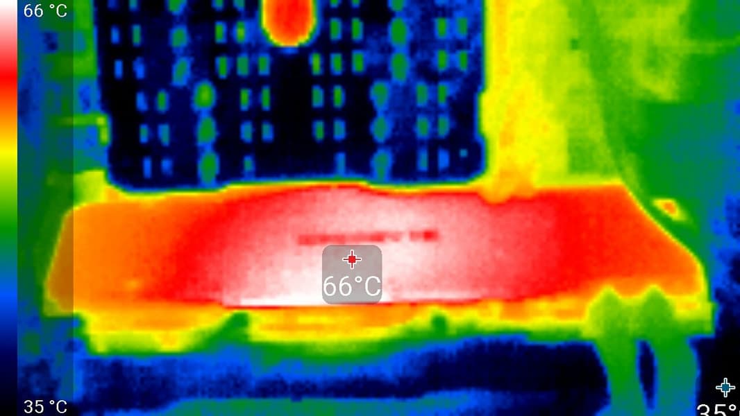 Максимальный нагрев — верхний край оборотной стороны PCB.