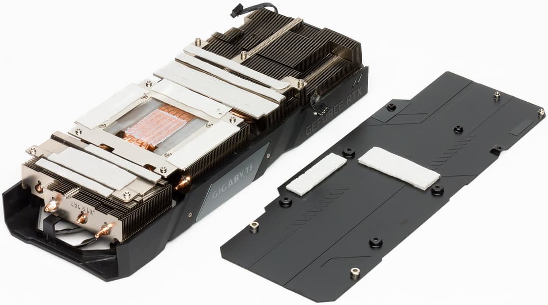 На подошве основного радиатора также имеется термоинтерфейс для охлаждения микросхем памяти. К силовым элементам конвертера питания прижимается подошва на другой части радиатора. На обороте карты установлена толстая пластина, служащая не только элементом жесткости, но и охладителем PCB.