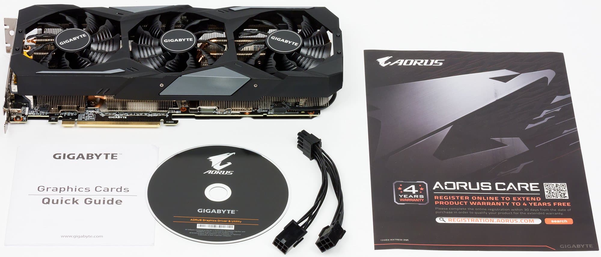 Перед нами традиционный кулер серии Windforce, представляющий собой трехсекционный радиатор с пластинчатыми ребрами, все части которого соединяются 4 тепловыми трубками, прижимающимися напрямую к микросхеме GPU.