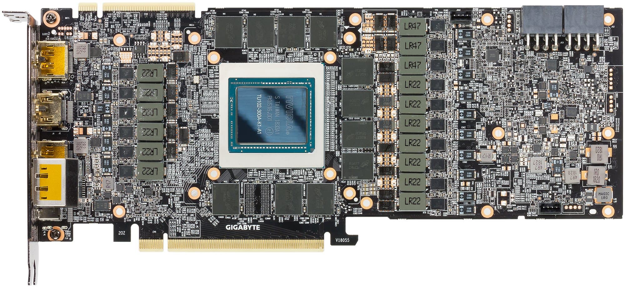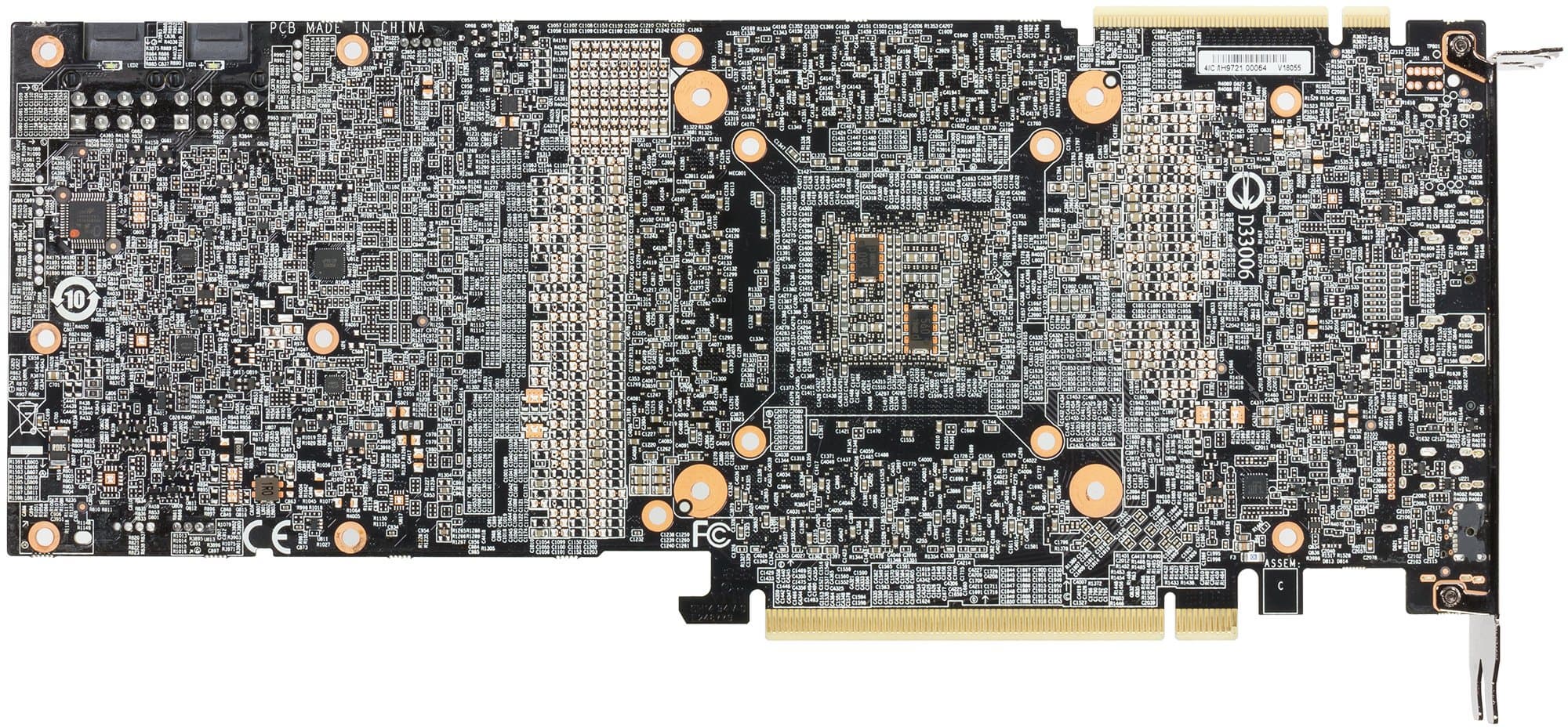У всех видеокарт на базе GeForce RTX 2080 Ti печатная плата имеет разведенную шину обмена с памятью в 384 бит, то есть можно установить до 12 32-битных микросхем памяти суммарным объемом в 12 ГБ, просто одна микросхема не установлена, таким образом получен объем в 11 ГБ и шина обмена с памятью в 352 бит.