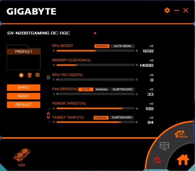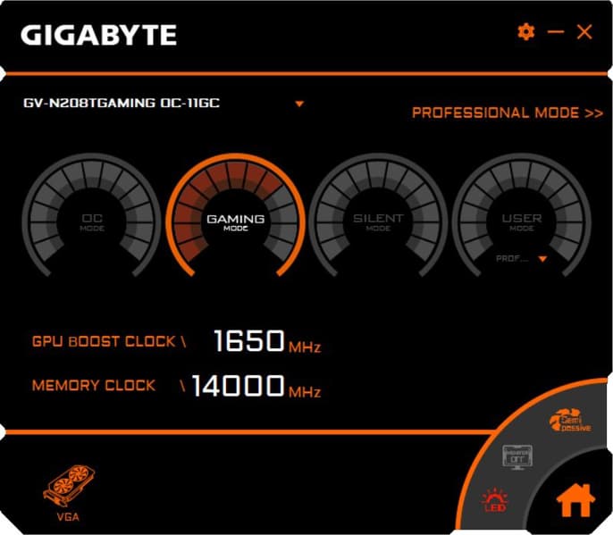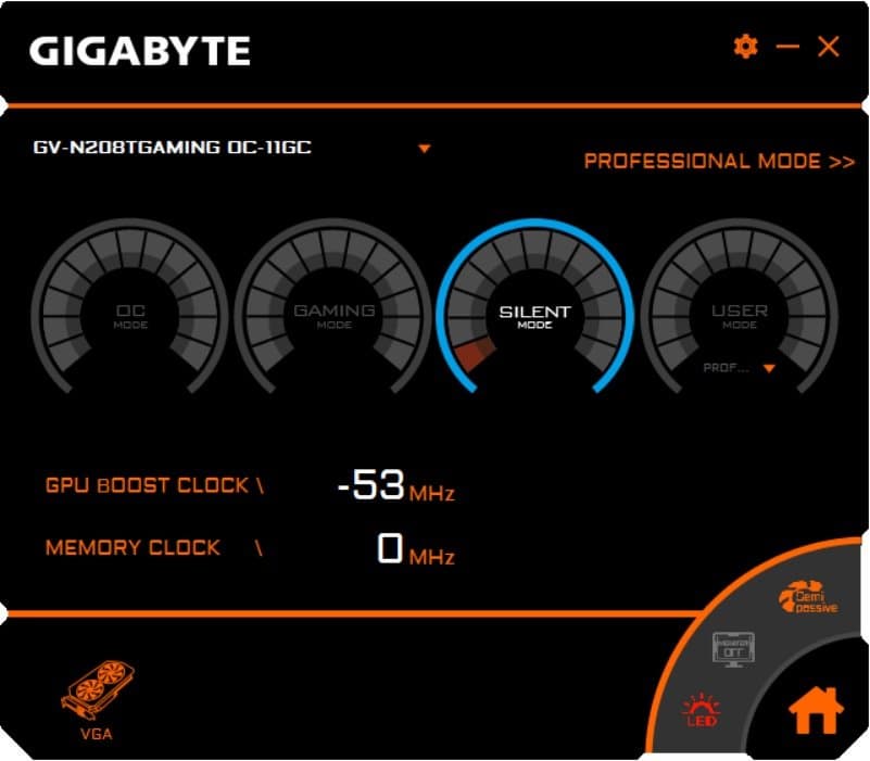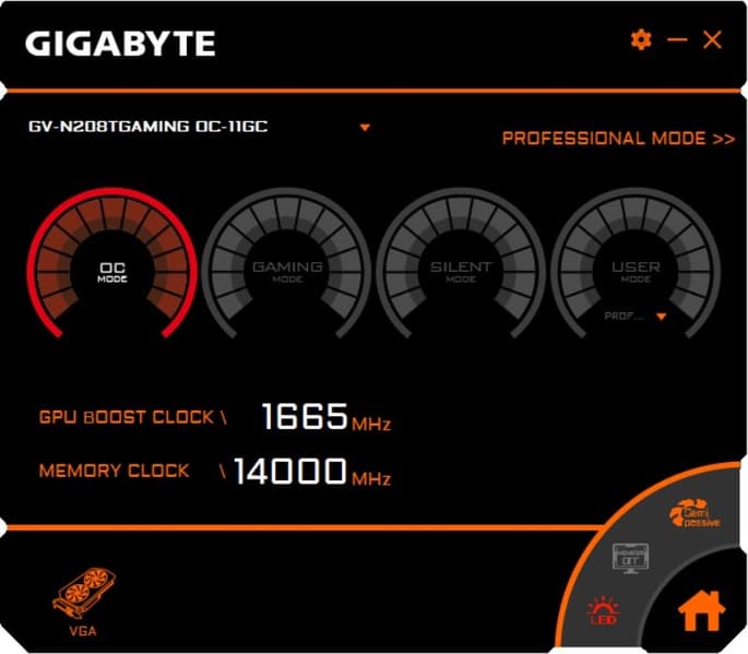 Управление работой карты обеспечивается с помощью фирменной утилиты Aorus Engine, о которой мы уже многократно писали. Программа позволяет легко переключаться на предустановленные параметры частот работы: OC Mode, Gaming Mode, Silent Mode:
