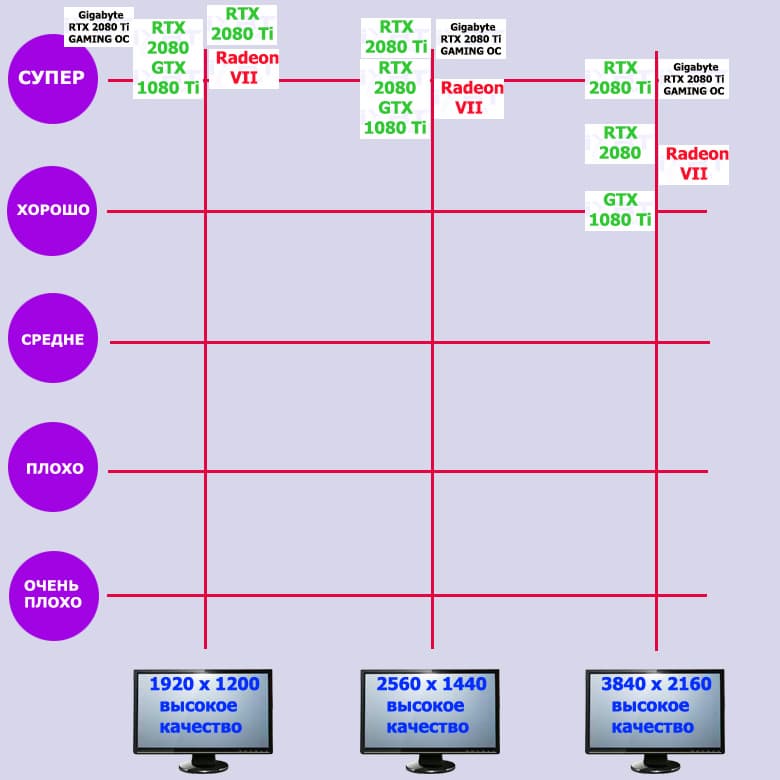 Ускоритель GeForce RTX 2080 Ti отлично подходит для разрешения 4К без каких-либо жертв в качестве картинки, то есть на нем прекрасно можно играть при максимальных настройках графики. Разумеется, можно играть и в более низких разрешениях, однако вряд ли рационально покупать ускоритель премиального класса не для того, чтобы играть на большом 4К-мониторе (телевизоре).