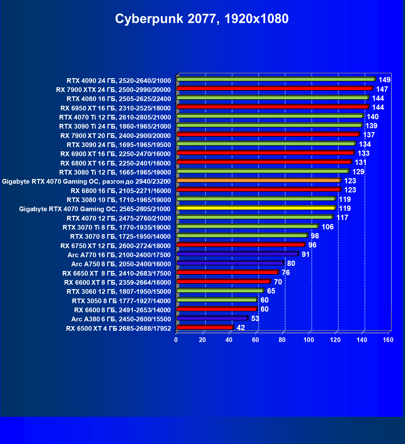 Ранее мы уже замечали, что в целом в классических играх GeForce RTX 4070 чуть быстрее, чем GeForce RTX 3080 (10 ГБ), при этом Radeon RX 6800 XT обходит обоих GeForce. А вот карта Gigabyte за счет фабричного разгона смогла обойти соперника из стана AMD. Также очевидно, что уже почти равный по стоимости Radeon RX 6900 XT смотрится явно лучше, нежели RTX 4070. Но стоит помнить, что в данном случае речь идет об играх без современных технологий трассировки лучей и «умного» масштабирования.