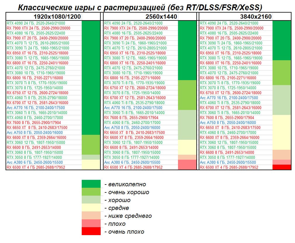Radeon 7900 XTX сейчас чуть-чуть дешевле, а 7900 XT вообще сильно дешевле, чем RTX 4080, ну потому если брать только классические игры, что первые более выгодны.