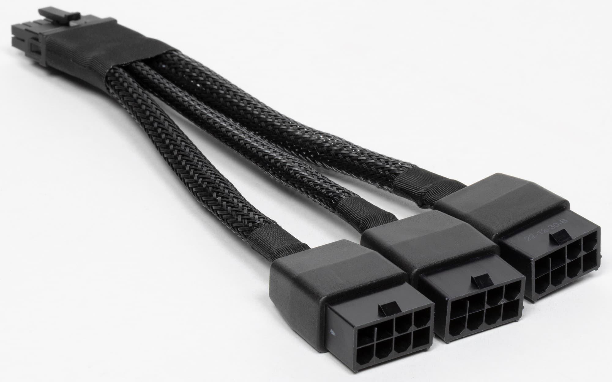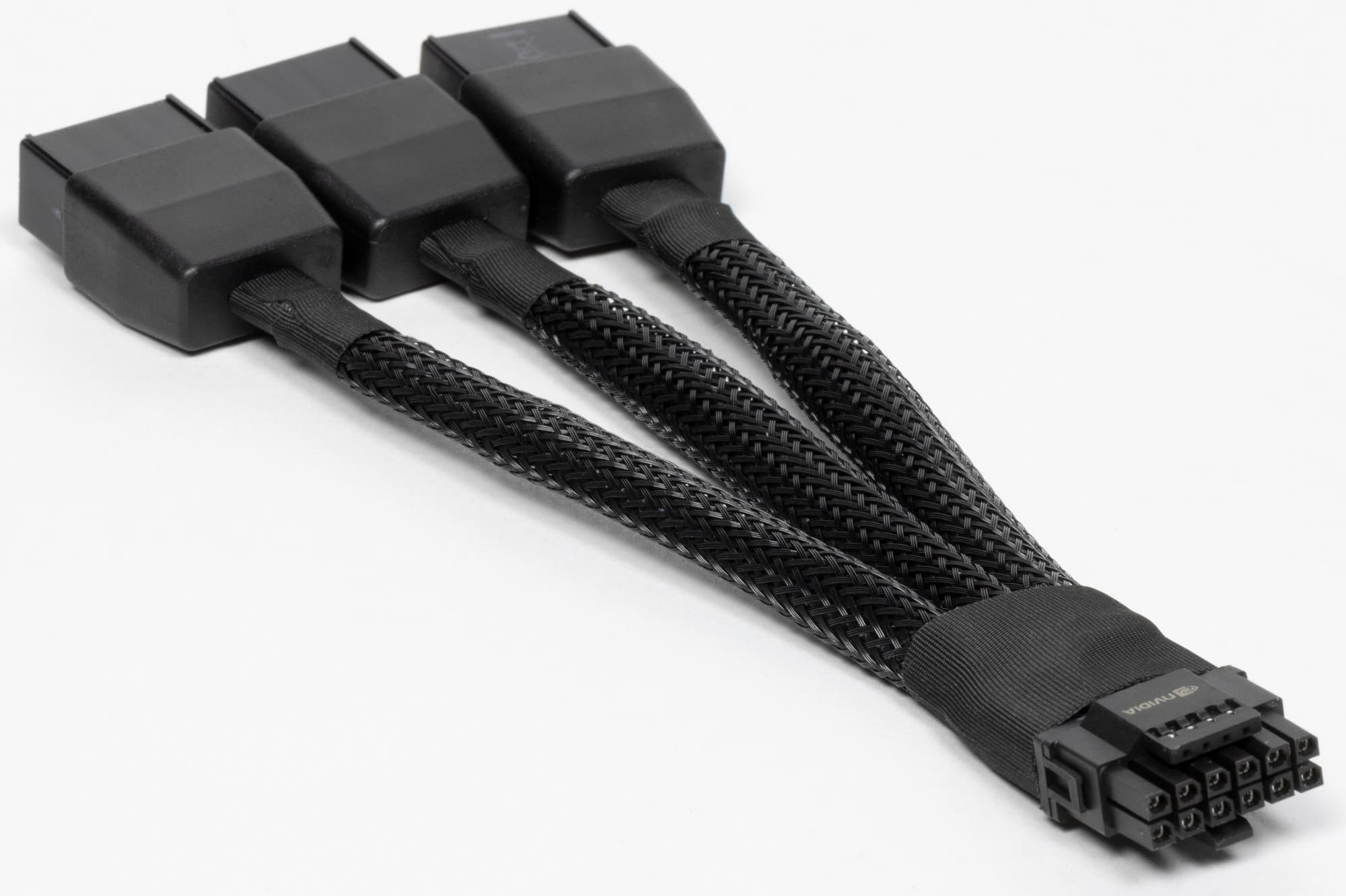 Карта Gigabyte имеет стандартный 16-контактный разъем питания версии PCIe 5.0. Несмотря на то, что в комплекте поставки имеется адаптер-переходник для подключения разъемов питания типа PCIe 2.0 (на 3 таких разъема), лучше все же использовать блоки питания стандарта ATX 3.0 с полноценной поддержкой питания стандарта PCIe 5.0 (с кабелем 12VHPWR). Имеющийся же переходник питания ни в коем случае нельзя изгибать непосредственно после 16-контактного разъема.