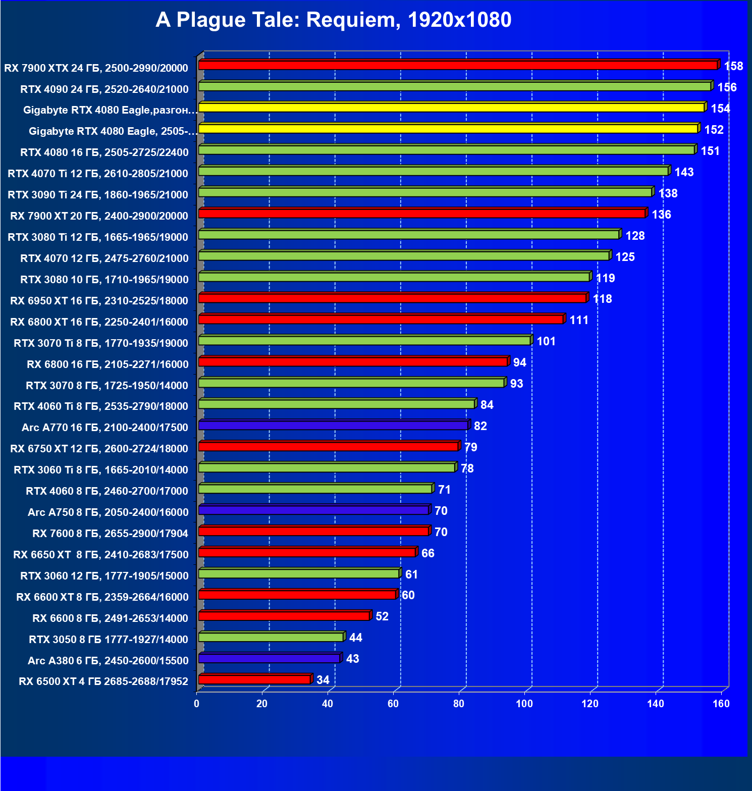 В классических играх тишь да гладь: все логично согласно многочисленным тестам, проведенным не один раз: выигрывает Radeon RX 7900 XTX, который по цене почти равен RTX 4080 (чуть дешевле).