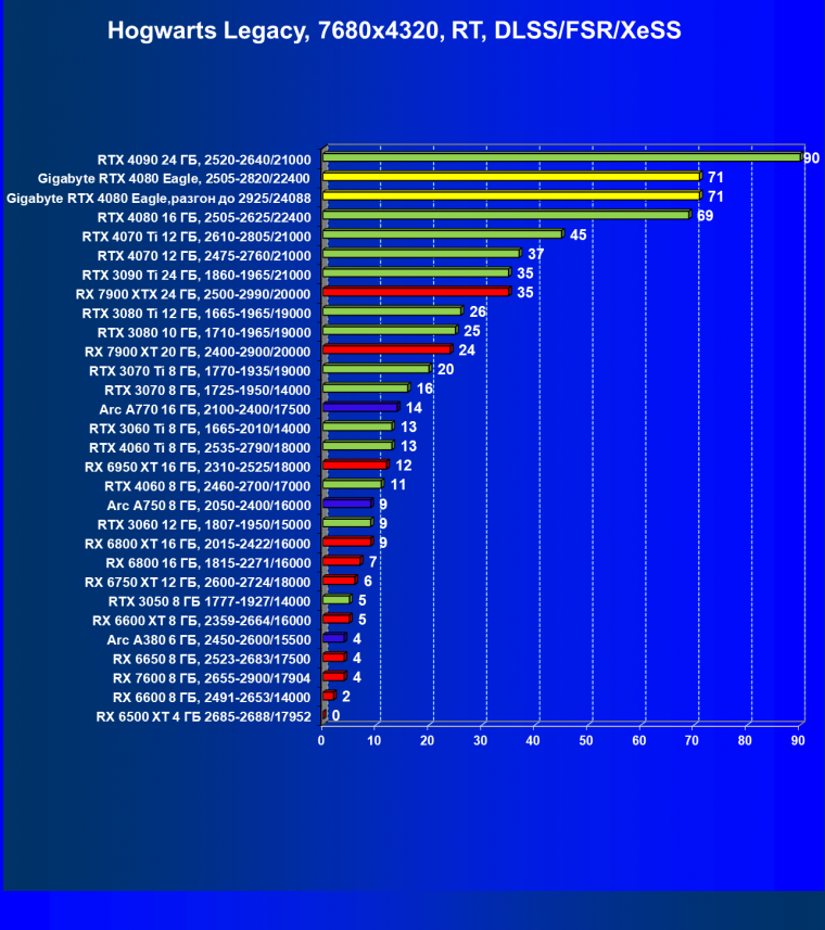 Результаты тестов с включенной аппаратной трассировкой лучей и DLSS/FSR/XeSS в разрешении 7680×4320 (8К)