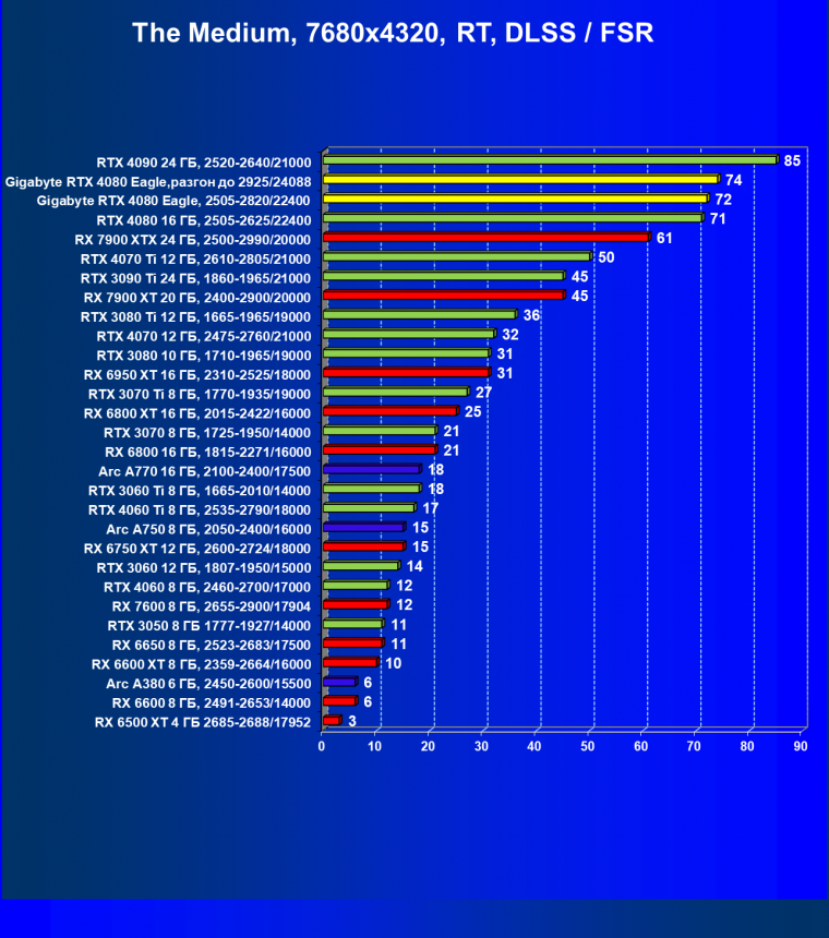 | 09 | RX 6950 XT 16 ГБ, 2310—2525/18000 | 901 | 113 | 80 000 |