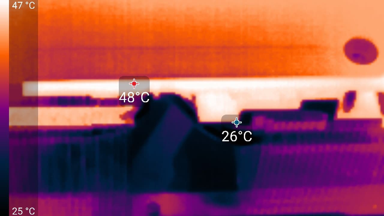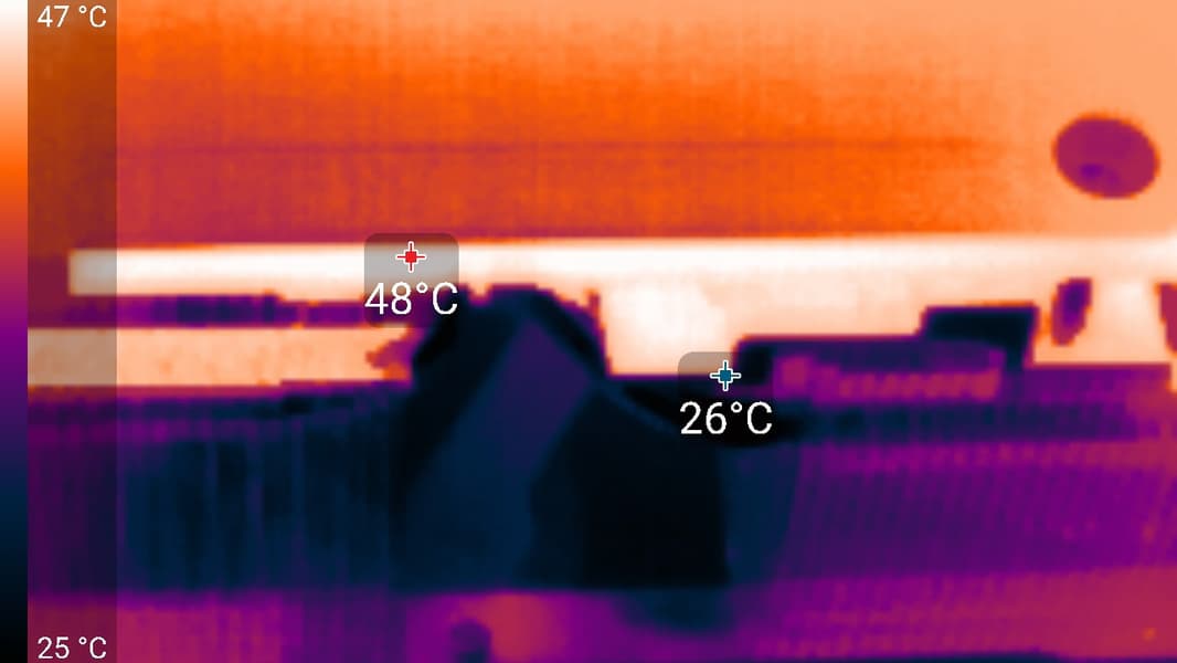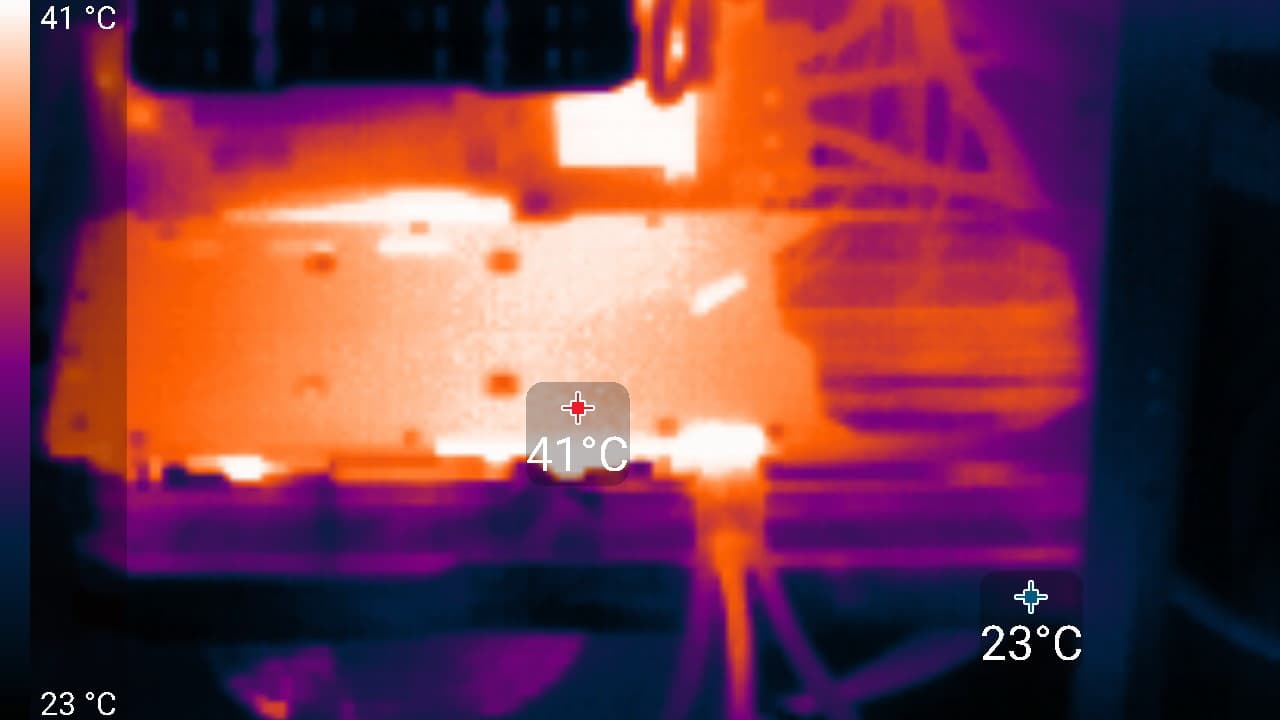 Максимальный нагрев наблюдался в центральной части PCB, а также около разъема питания. Стоит обратить внимание на переходник питания с трех 8-контактных разъемов на один 16-контактный, который входит в комплект поставки.