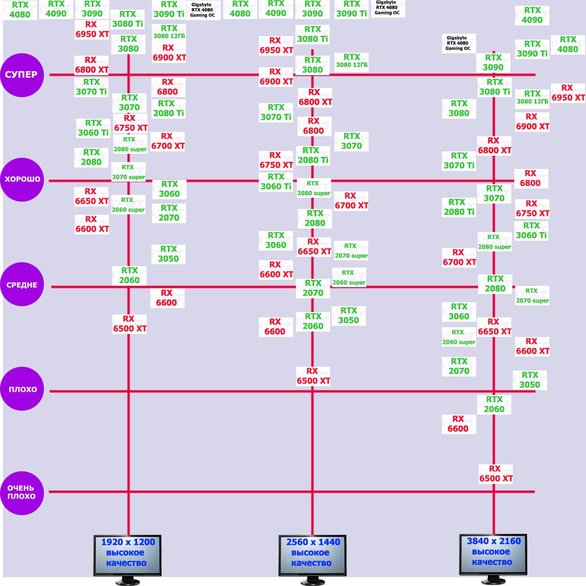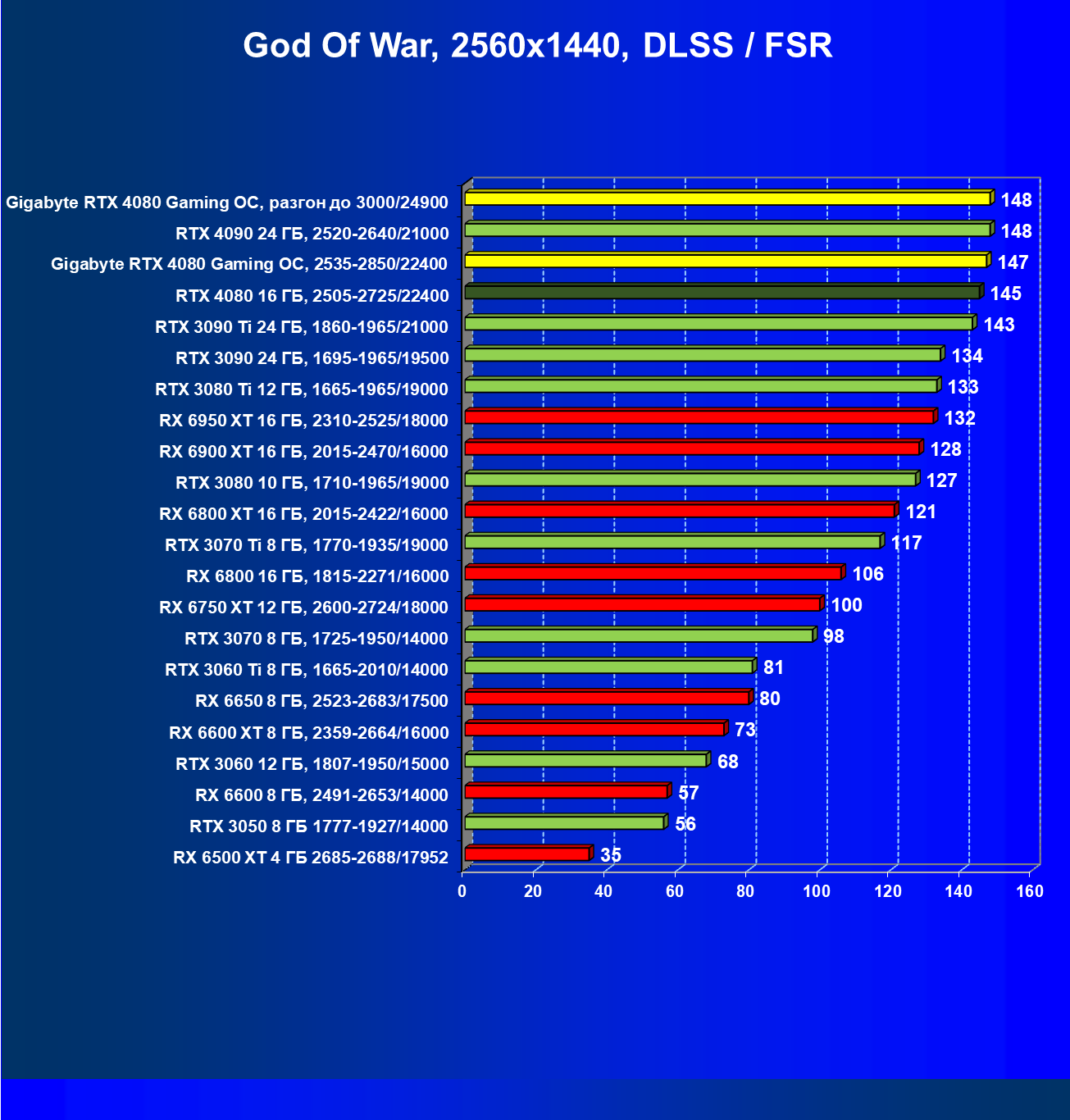| 03 | Gigabyte RTX 4080 Gaming OC, 2535—2850/22400 | 507 | 43 | 118 000 |