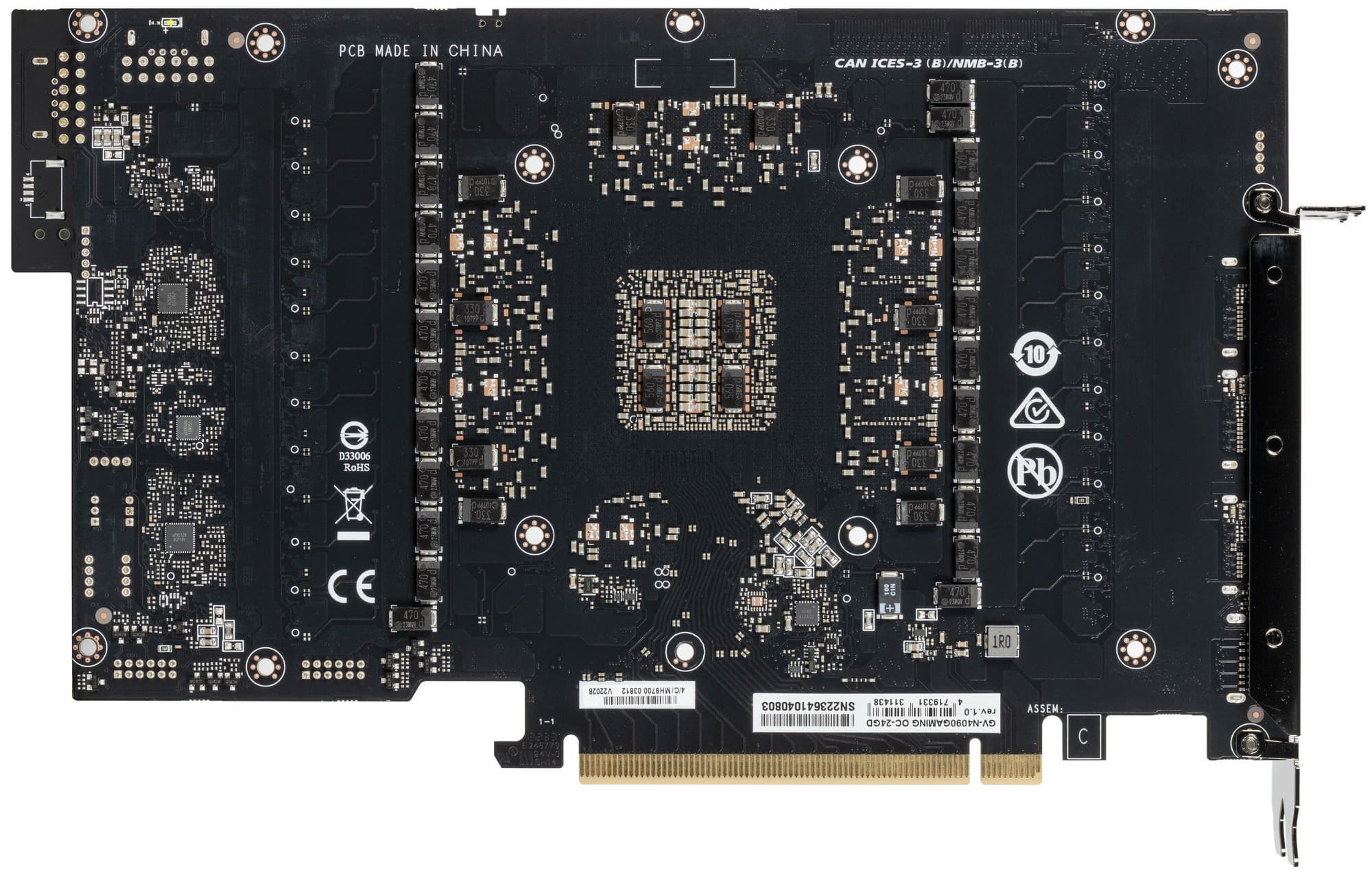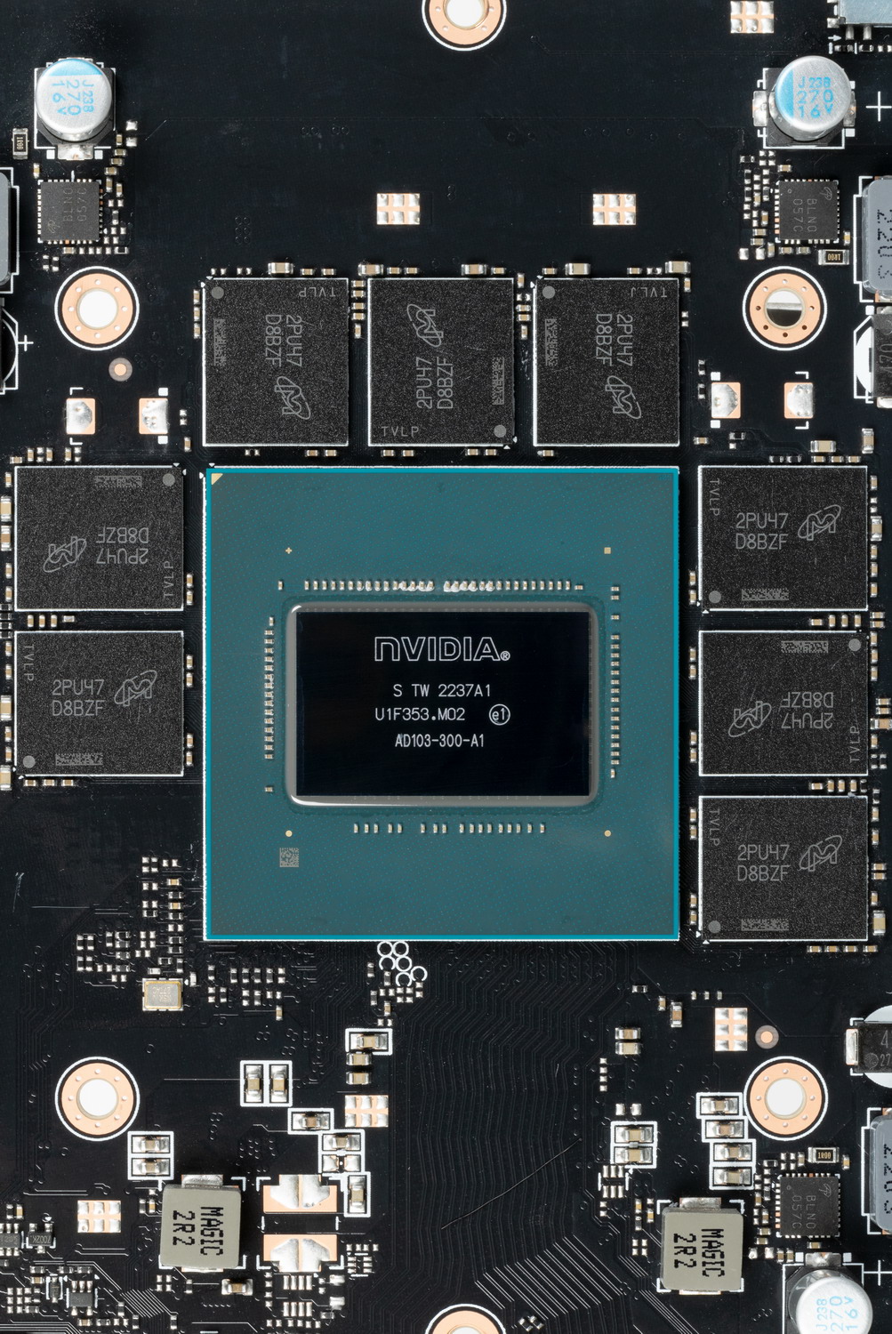 Карта имеет 16 ГБ памяти GDDR6X SDRAM, размещенной в 8 микросхемах по 16 Гбит на лицевой стороне PCB. Микросхемы памяти Micron (GDDR6X, MT61K512M32KPA-24 / D8BZF) рассчитаны на номинальную частоту работы в 3000 (24000) МГц.