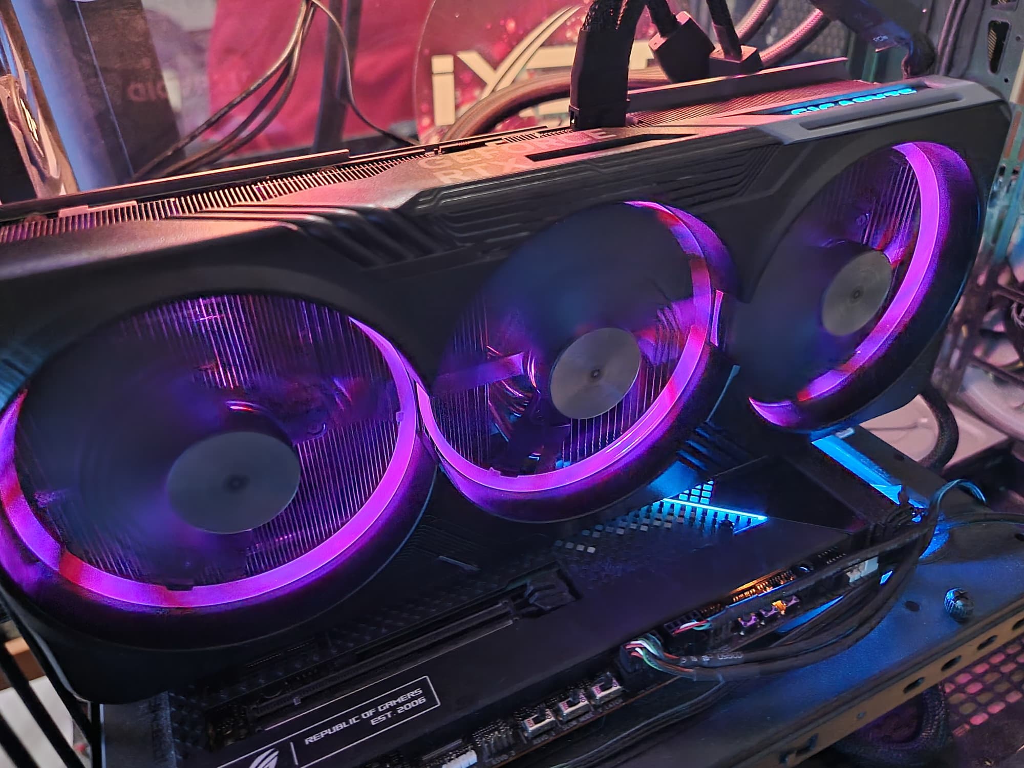Карта имеет подсветку по ободам вентиляторов, а также подсвечен логотип компании на верхнем торце. Подсветка вокруг вентиляторов включается только при их вращении; когда они стоят — свечения нет.