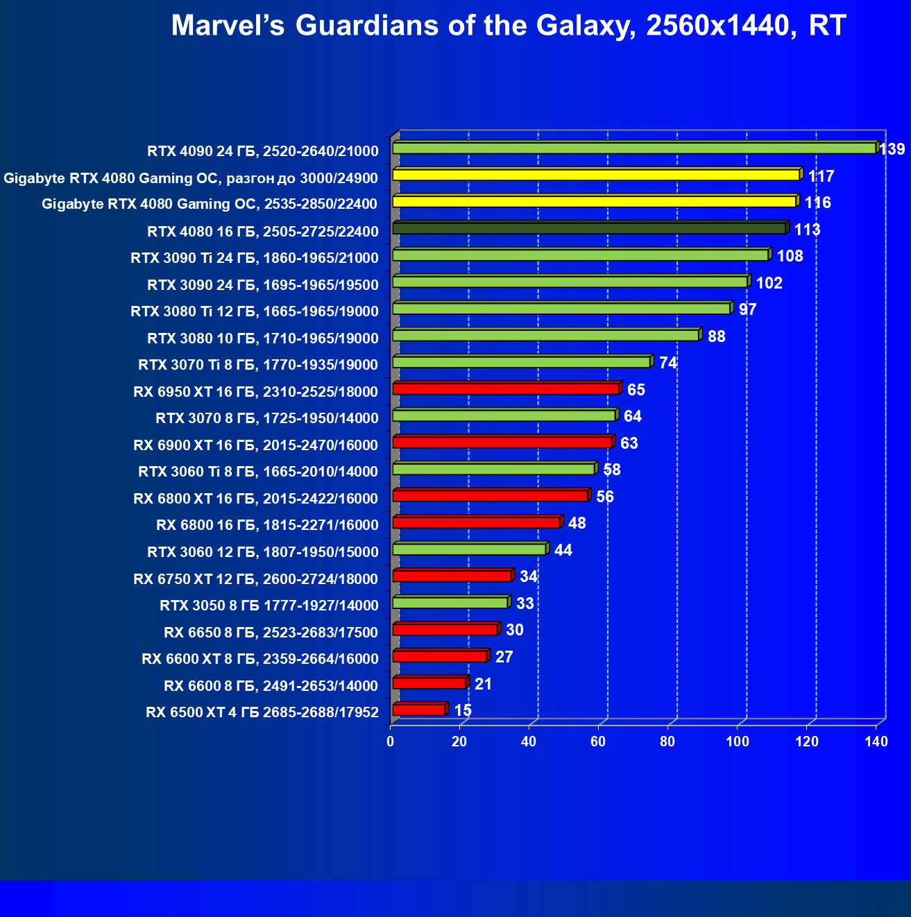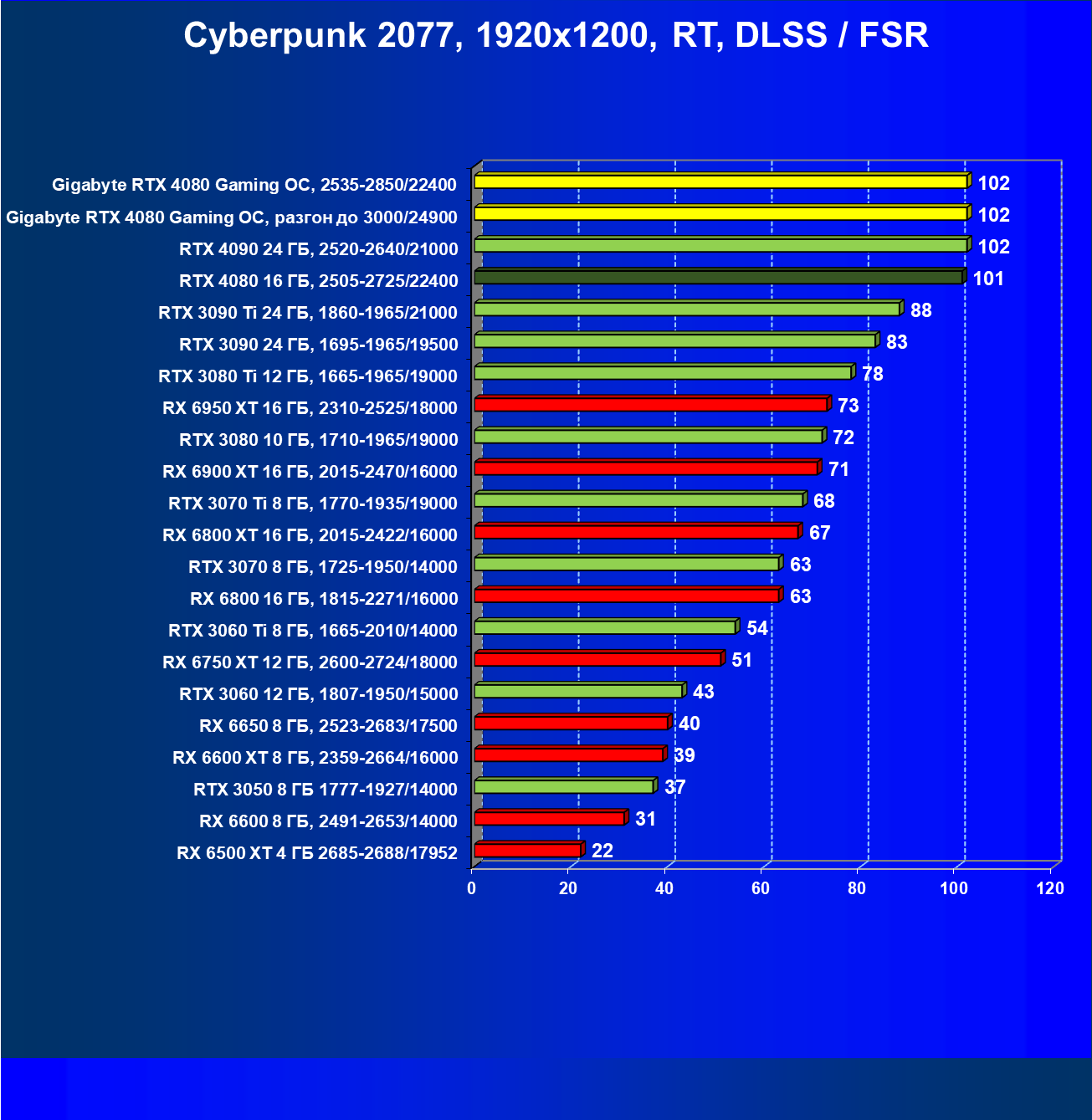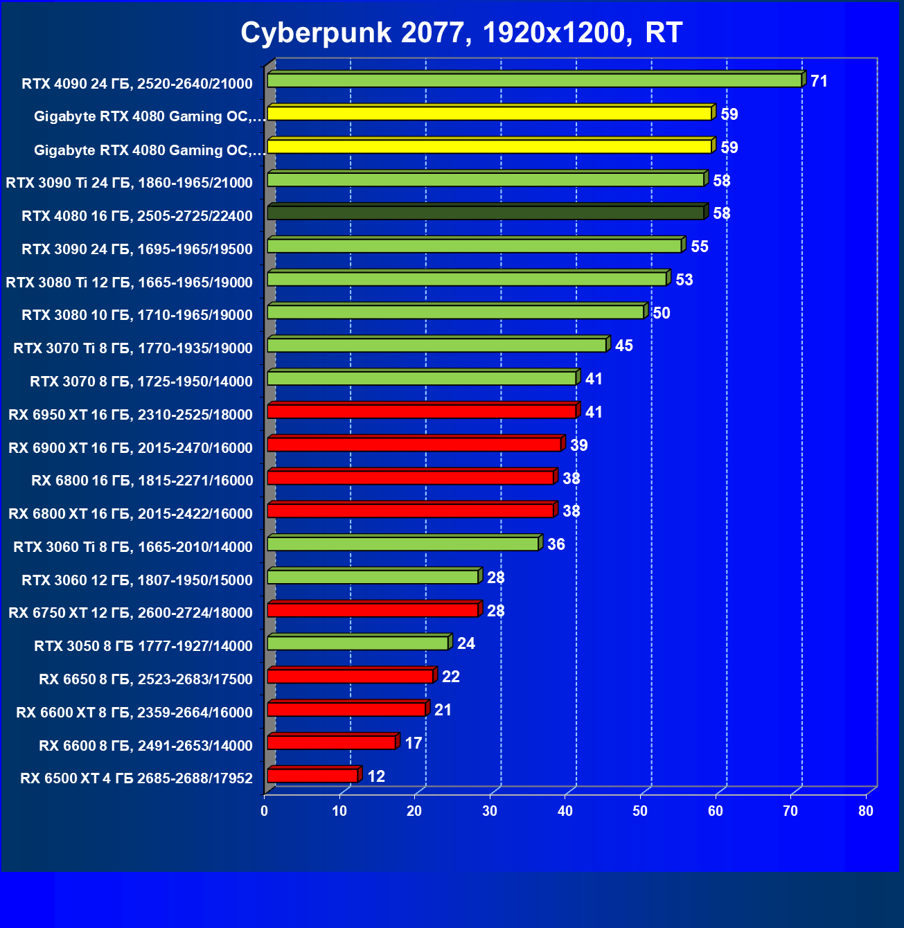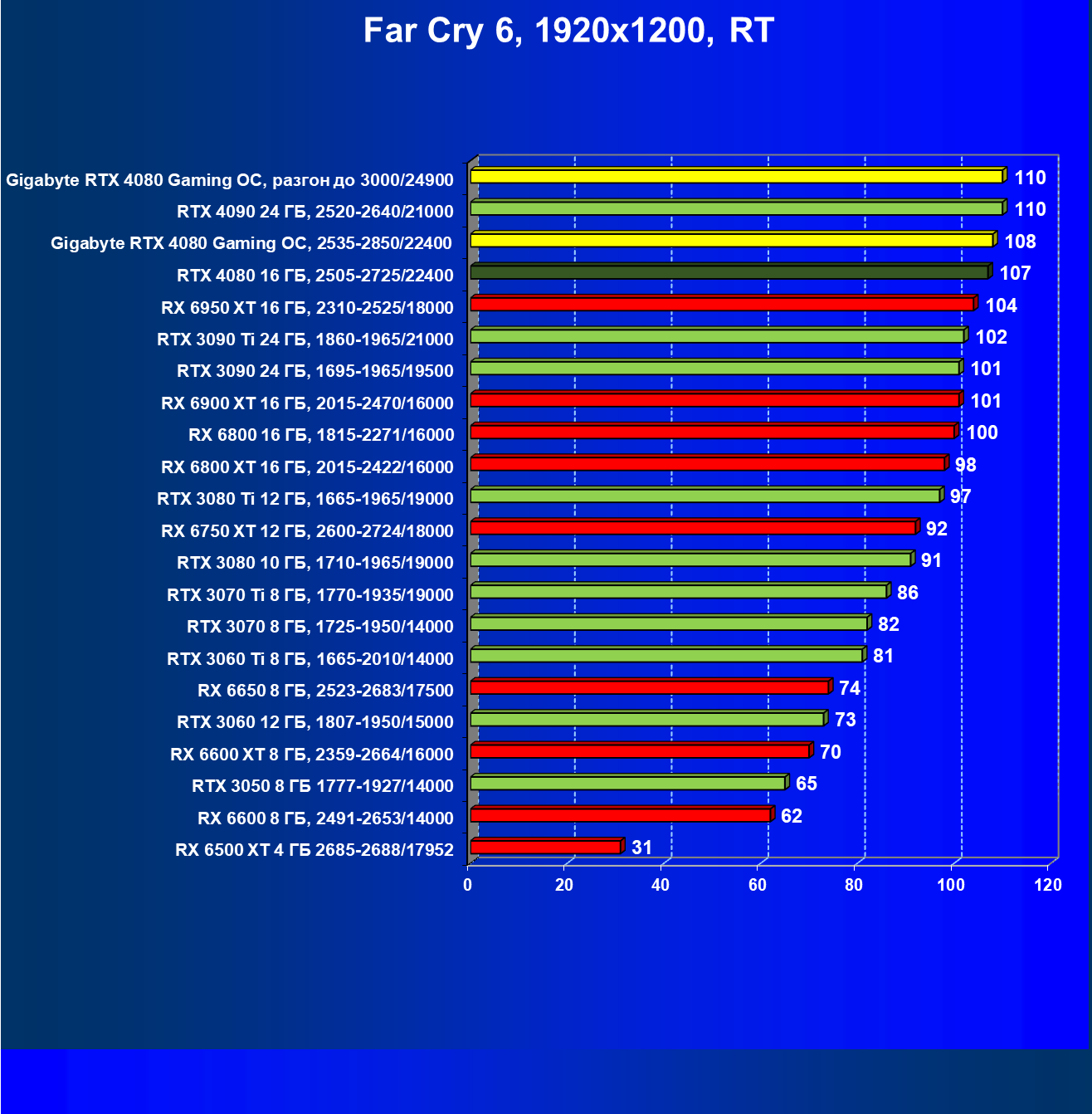 | 20 | Gigabyte RTX 4080 Gaming OC, 2535—2850/22400 | 71 | 837 | 118 000 |