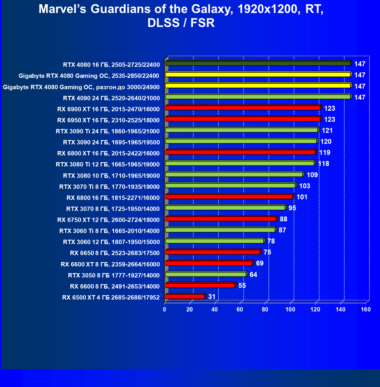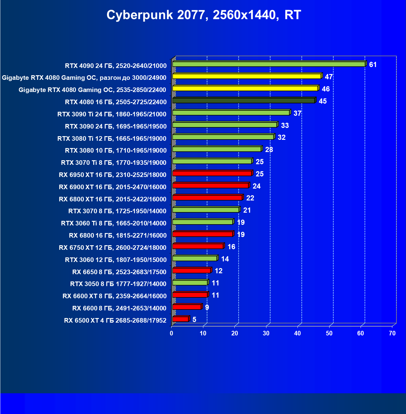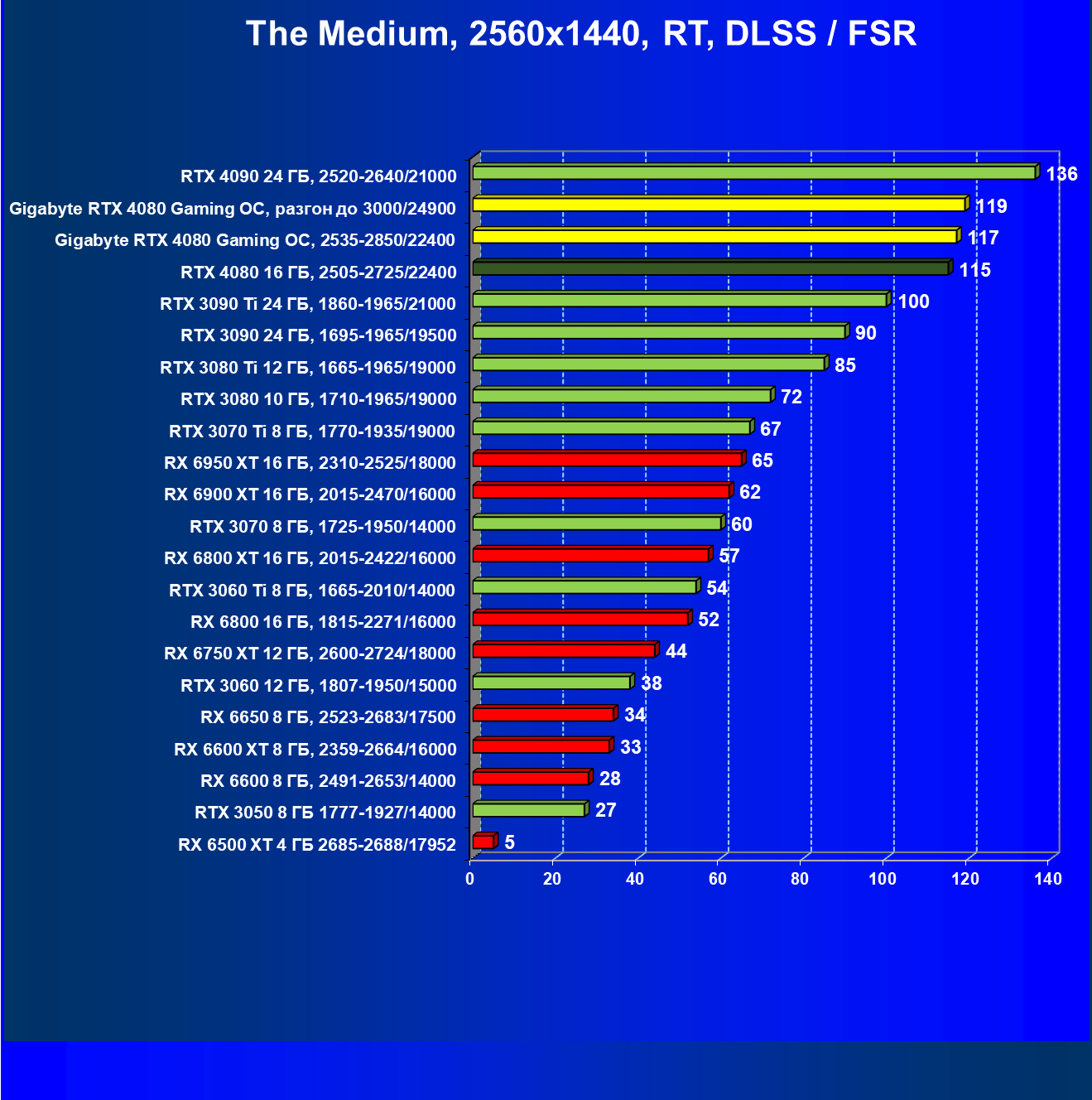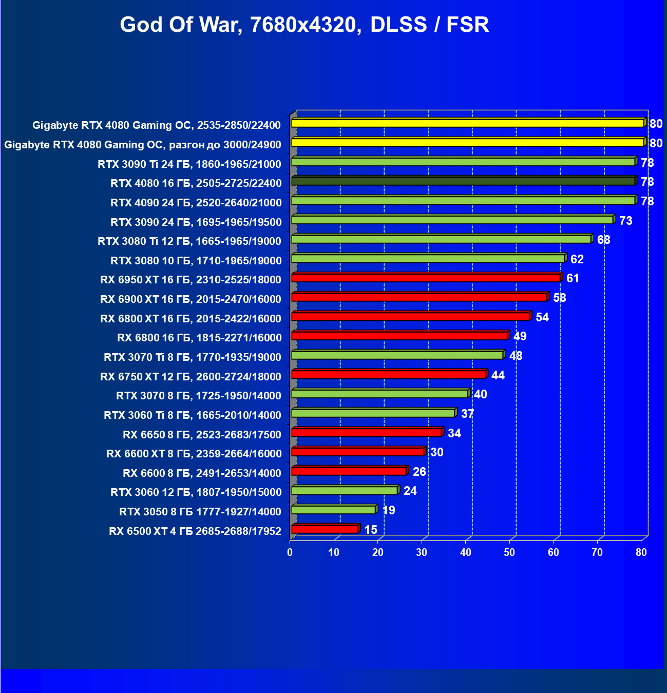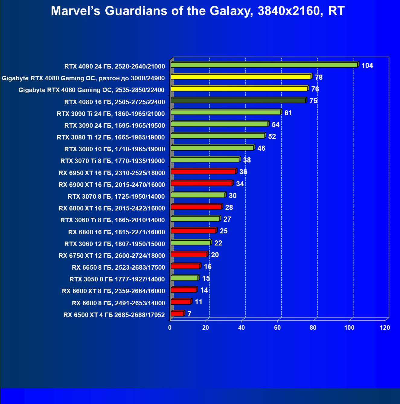 | 20 | Gigabyte RTX 4080 Gaming OC, 2535—2850/22400 | 71 | 837 | 118 000 |