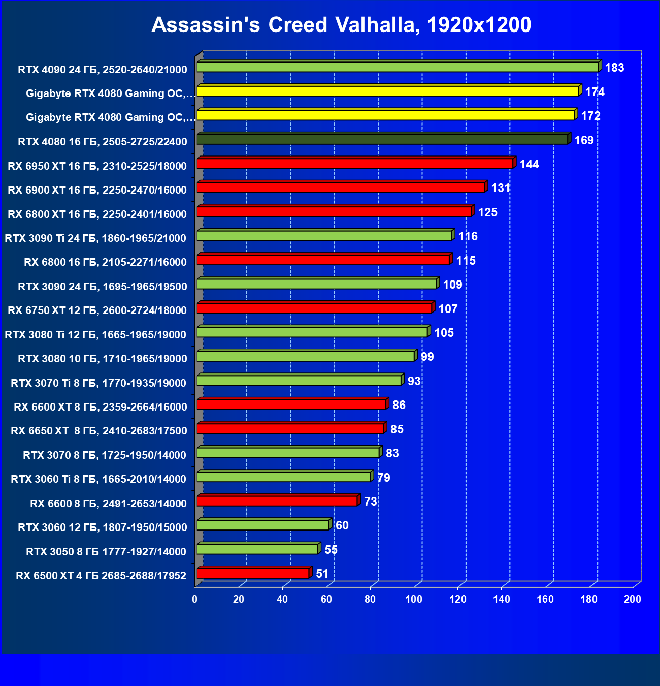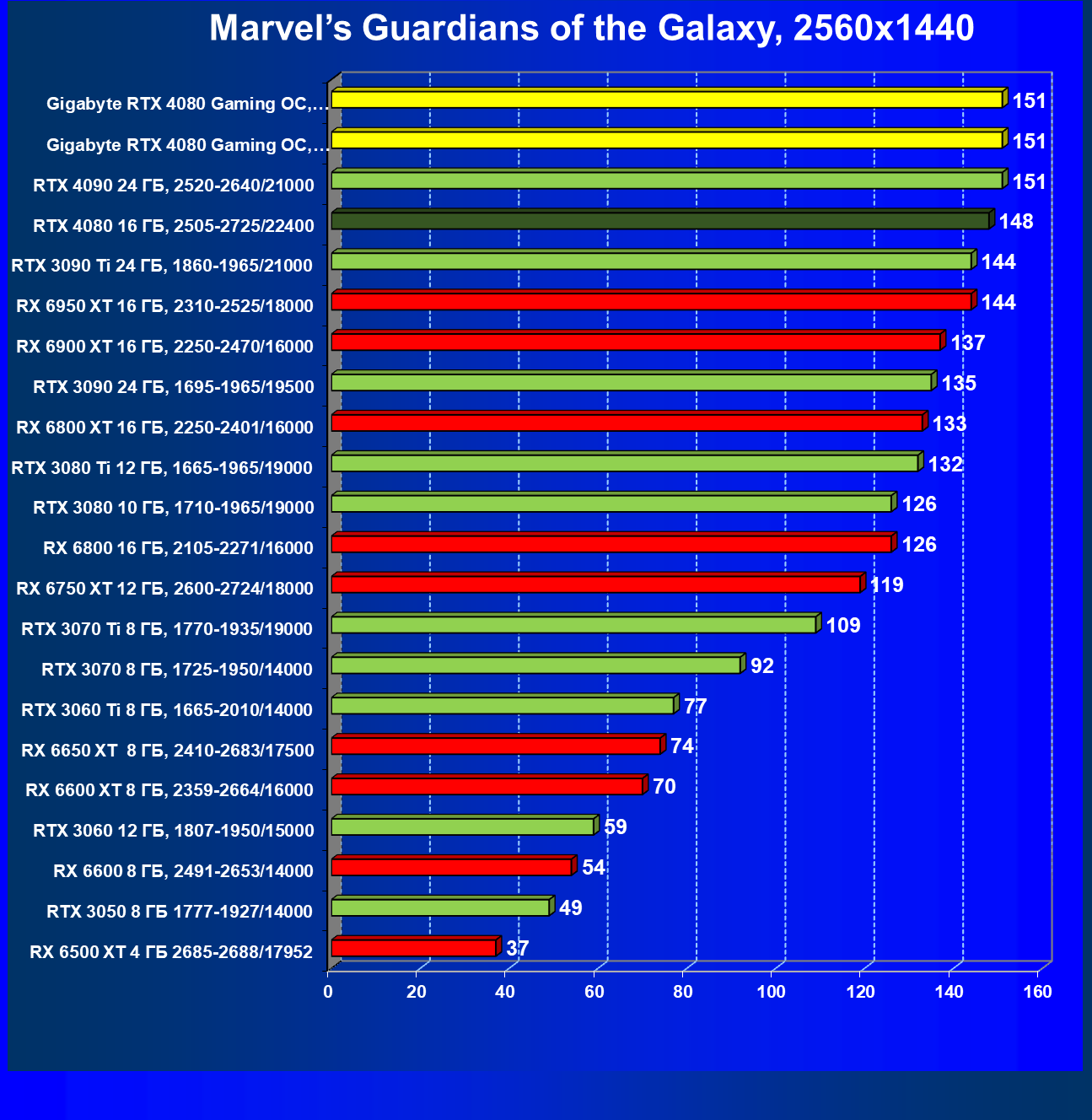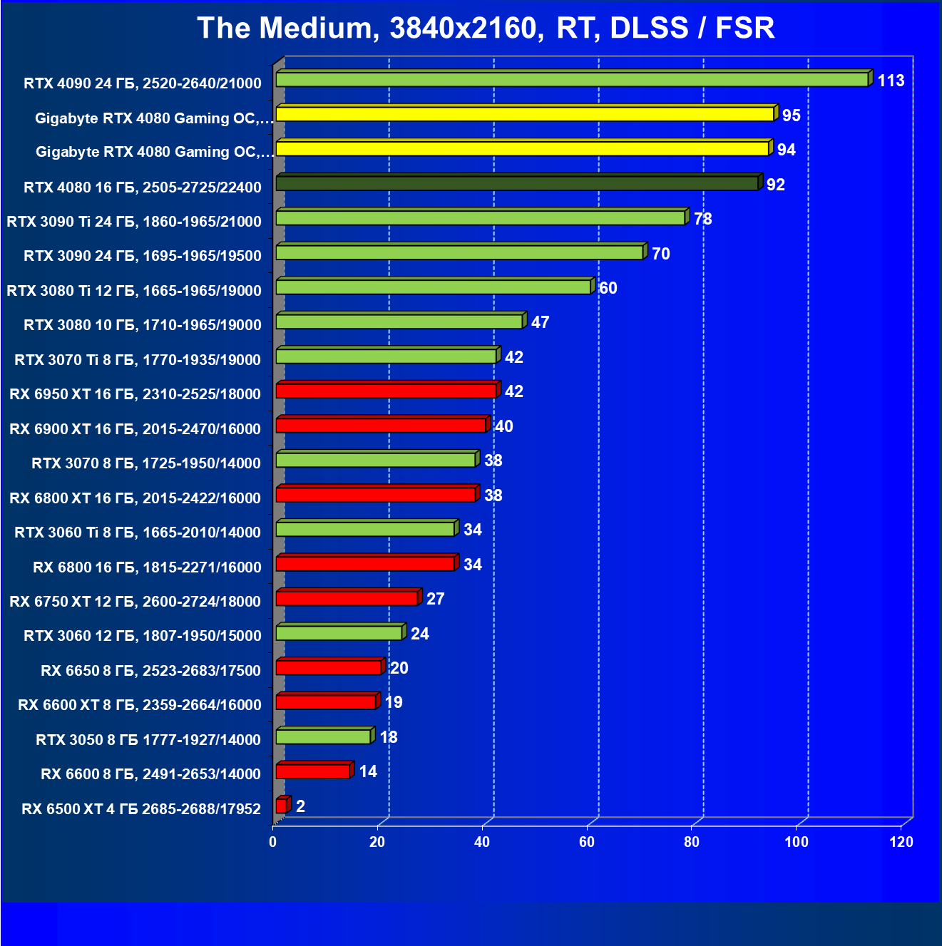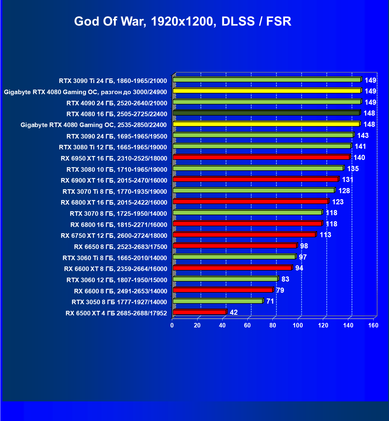 | 20 | Gigabyte RTX 4080 Gaming OC, 2535—2850/22400 | 71 | 837 | 118 000 |