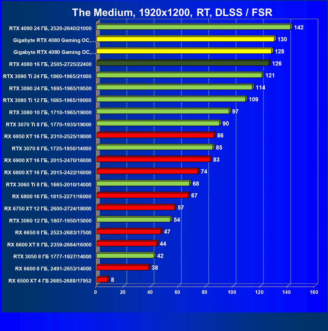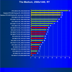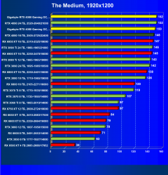 Почти все вышесказанное справедливо и здесь, за исключением того, что флагманы AMD оказались аутсайдерами, да и вообще сейчас уже нет смысла в приобретении таких карт. Прекрасно видно, что из-за чрезмерно завышенных цен RTX 4080 выигрывает только у Radeon RX 6950/6900 XT.