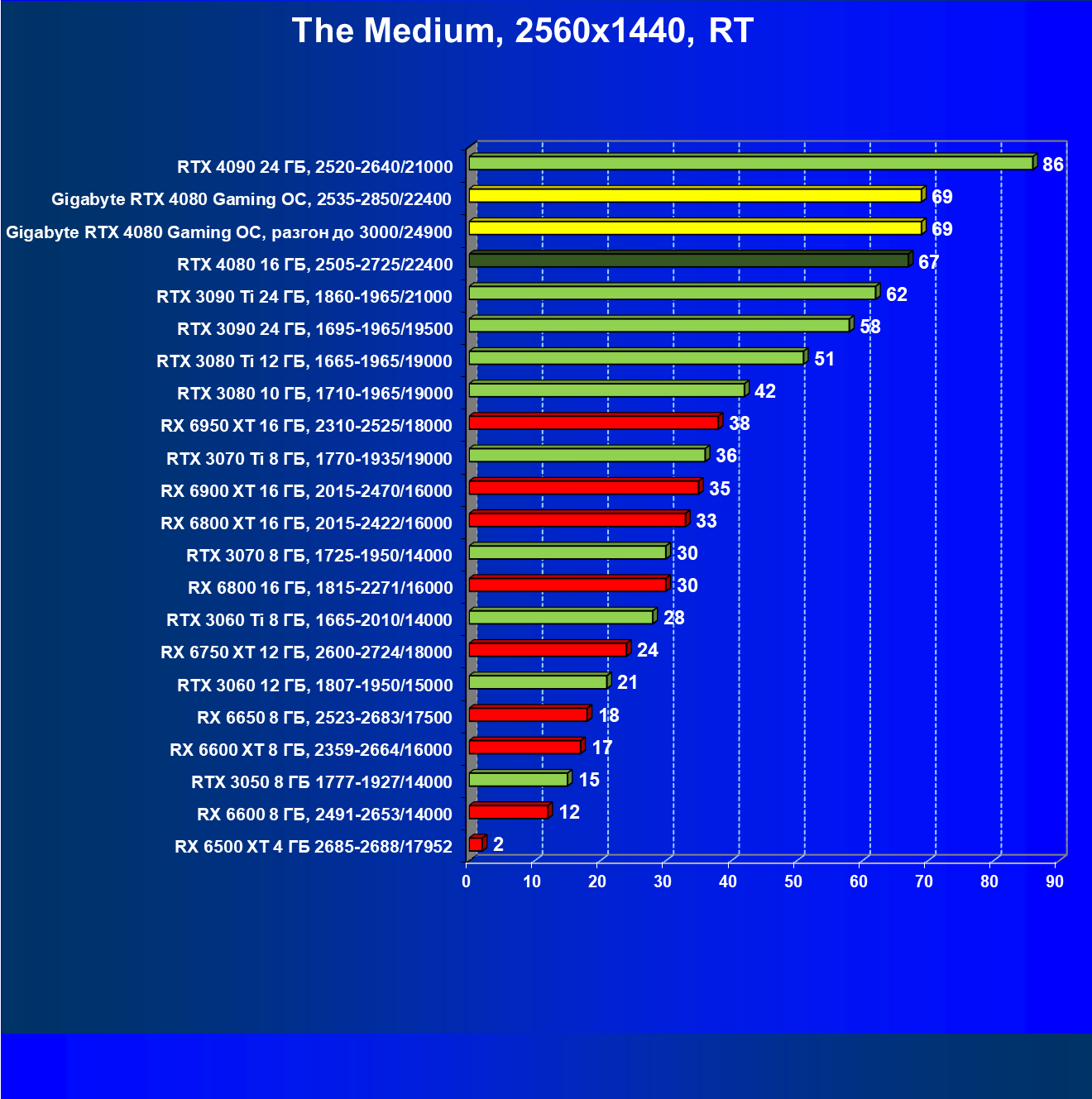 Четкое второе место у RTX 4080 после RTX 4090 очевидно, средний выигрыш в производительности у RTX 4080 относительно RTX 3090 Ti и RX 6950 XT по всем разрешениям составляет 11%, а в разрешении 4К — 16%-17%. Карта Gigabyte за счет фабричного разгона быстрее еще на 2%-2,5%.