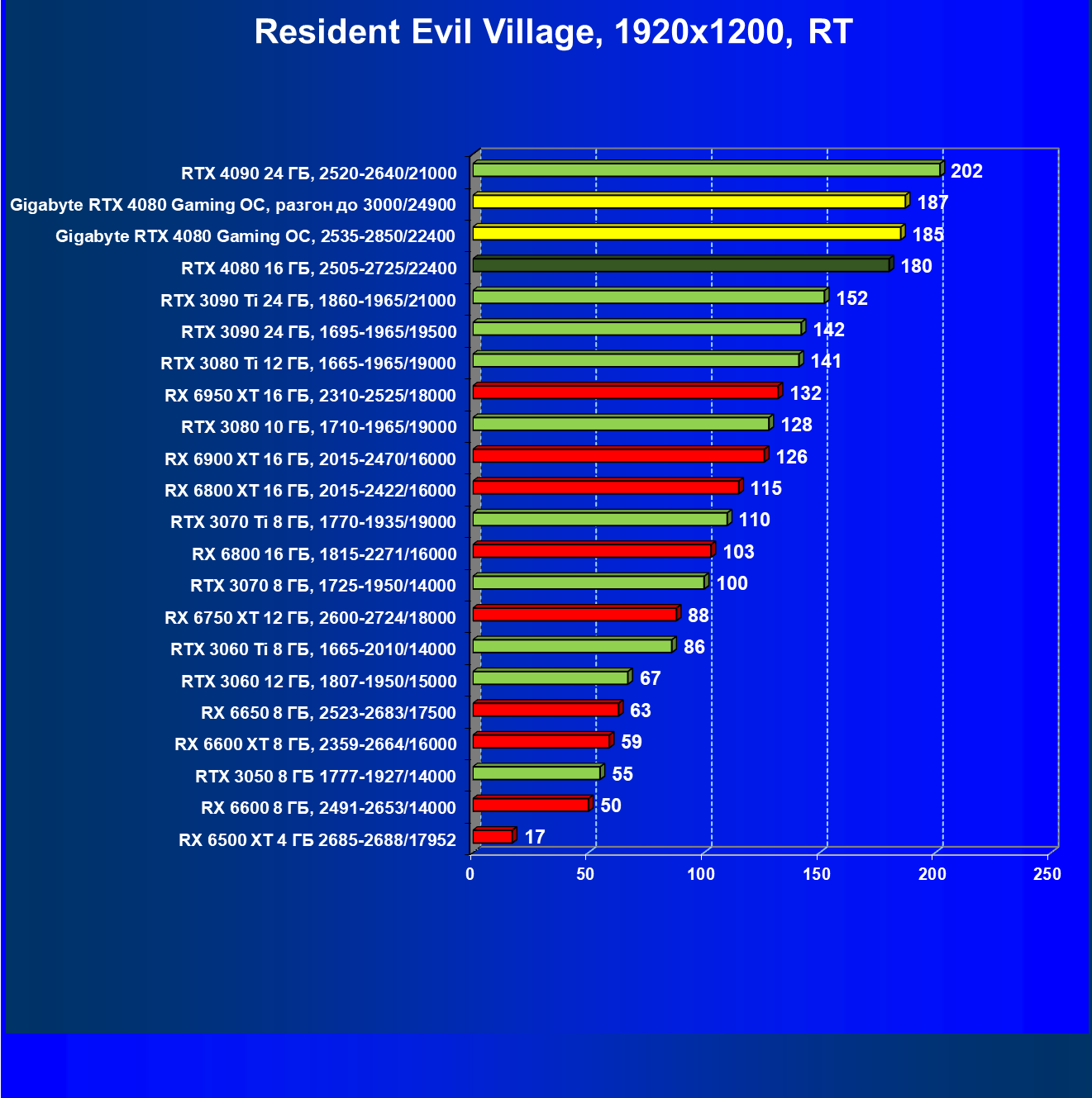 В данном случае преимущество RTX 4080 над флагманами AMD выражено еще более ярко. В среднем прирост производительности относительно RTX 3090 Ti по всем разрешениям составляет 14,5%, а в разрешении 4К — 17%. Карта Gigabyte за счет фабричного разгона опять же еще немного быстрее. Разница же в производительности с RX 6950 XT в данном случае составляет 35% по всем разрешениям и аж 58%(!) в 4К.