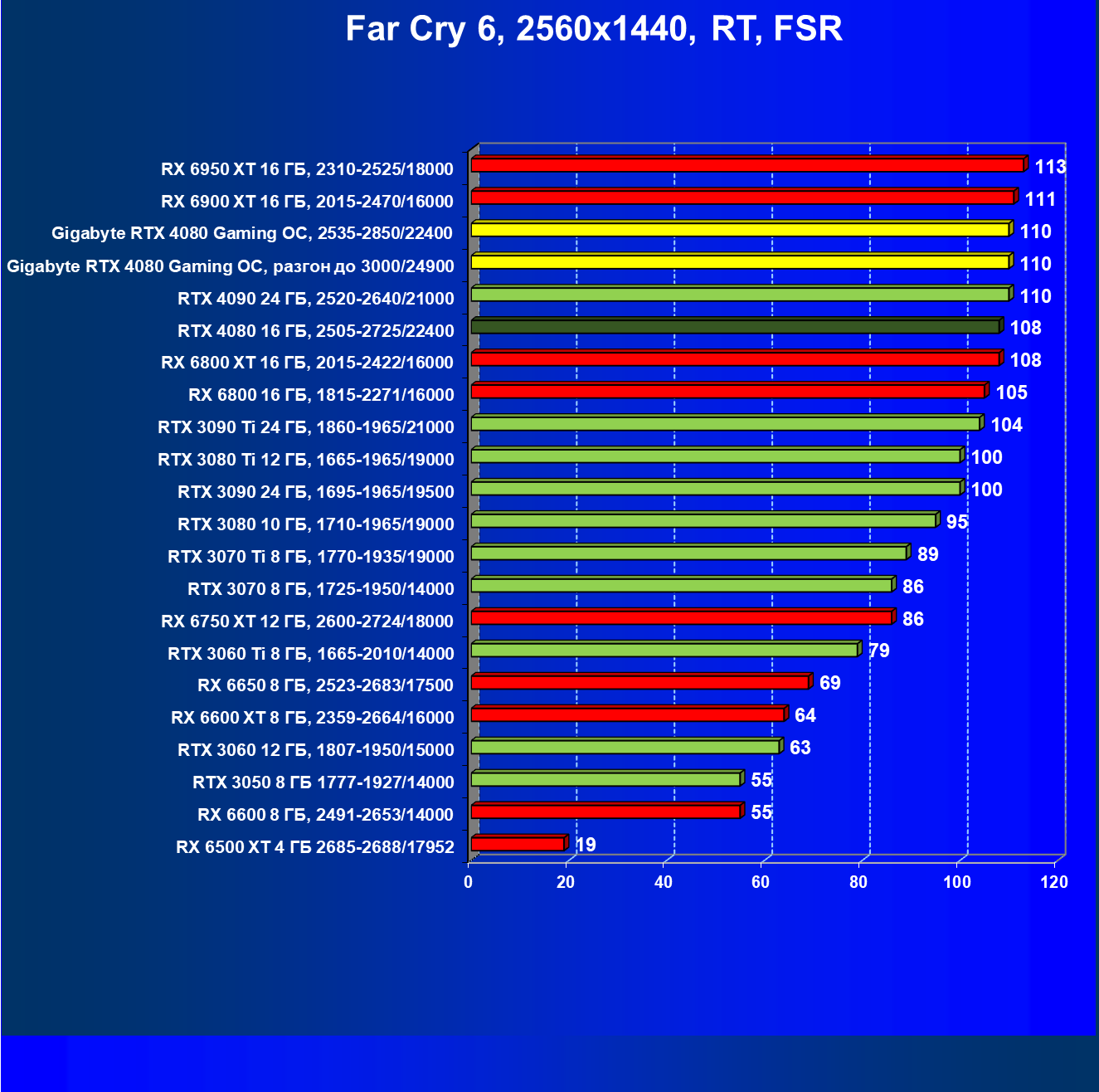 | 19 | RX 6900 XT 16 ГБ, 2250—2470/16000 | 111 | 832 | 75 000 |