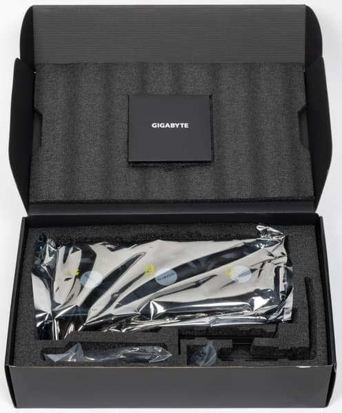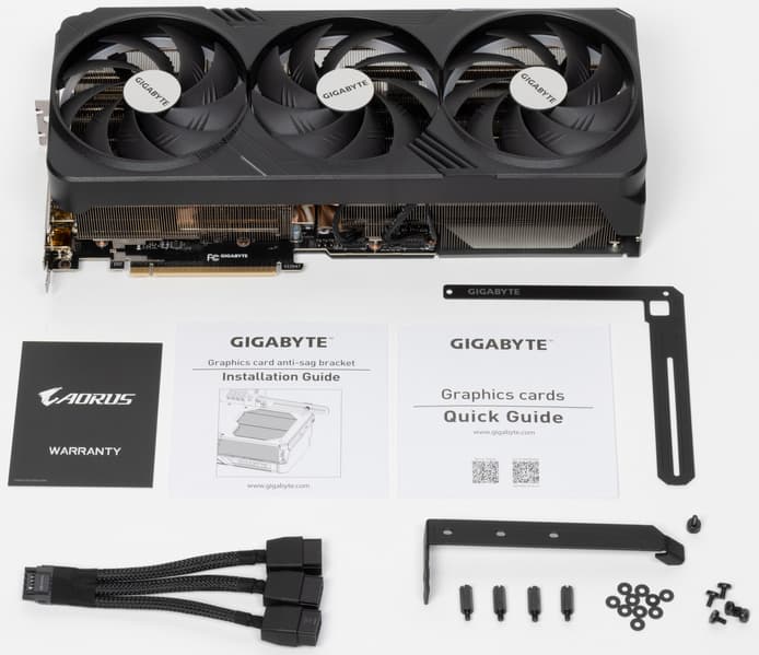 Карта Gigabyte имеет стандартный 16-контактный разъем питания версии PCIe 5.0. Несмотря на то, что в комплекте поставки имеется адаптер-переходник для подключения разъемов питания типа PCIe 2.0 (на 3 таких разъема), лучше все же использовать блоки питания стандарта ATX 3.0 с полноценной поддержкой питания стандарта PCIe 5.0 (с кабелем 12VHPWR). Имеющийся же переходник питания ни в коем случае нельзя изгибать непосредственно после 16-контактного разъема. Также стоит отметить подсветку вентиляторов только при их вращении, которая смотрится очень эффектно. К сожалению, при синхронизации подсветки с материнскими платами Gigabyte набор эффектов резко сокращается до простых и неинтересных.