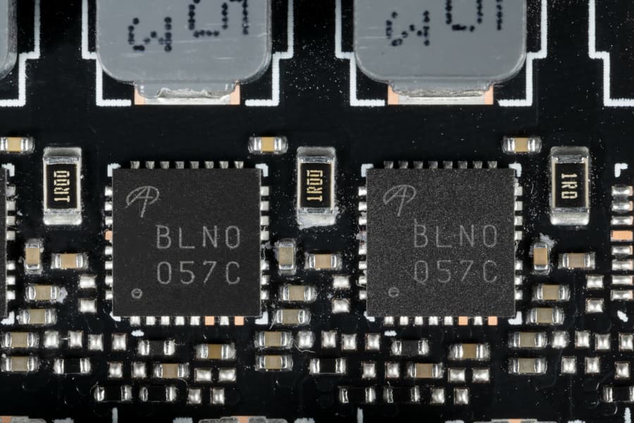 В преобразователе питания, традиционно для всех видеокарт Nvidia, используются транзисторные сборки DrMOS — в данном случае AOZ5316 (Alpha&Omega Semiconductor), каждая из которых рассчитана максимально на 55 А.