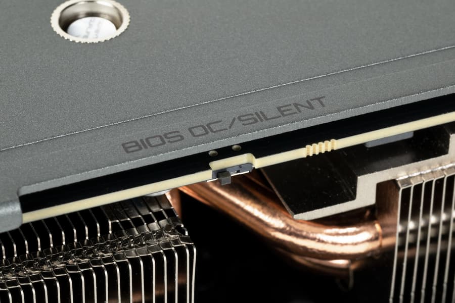 Карта имеет два режима работы, они заложены в двух вариантах BIOS, которые переключаются с помощью переключателя на верхнем торце карты: OC и Silent. Разница между режимами заключается, по сути, только в оборотах вентиляторов, а предел энергопотребления для обеих версий BIOS заложен в 350 Вт.