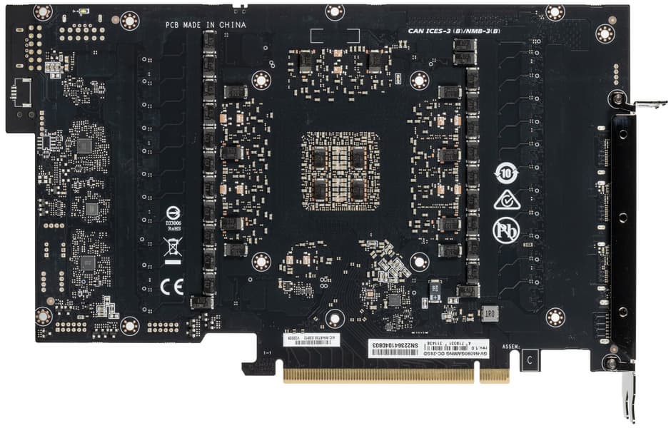 Интересно сравнить карту Gigabyte с ее же продуктом на базе RTX 4090. В целом мы видим, что общего много, схема питания почти одинаковая. Однако GPU у данных плат разные, они отличаются по размерам не только кристаллов, но и их упаковки, поэтому использовать одну и ту же PCB все-таки не представляется возможным. Печатная плата под RTX 4080 имеет максимальную ширину шины 256 бит.