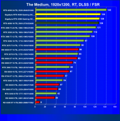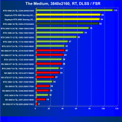 Рейтинг составлен по 9 тестам, в которых используется технология трассировки лучей и одновременно технология Nvidia DLSS или AMD FSR. Этот рейтинг нормирован по самому слабому ускорителю в данной группе — Radeon RX 6500 XT (то есть сочетание скорости и функций Radeon RX 6500 XT приняты за 100%).