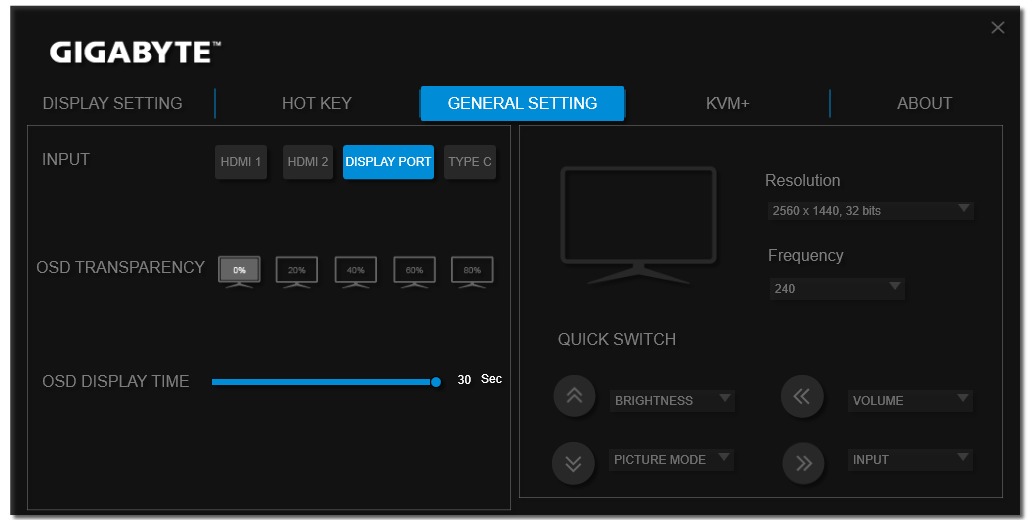 При подключении к компьютеру по DisplayPort поддерживалось разрешение до 2560×1440 при 240 Гц кадровой частоты на вход, и вывод изображения на экран также осуществлялся с этой частотой с 8 бит на цвет и с 10 бит при снижении частоты до 200 Гц. В случае HDMI — до 2560×1440 при 144 Гц и 8 бит, а при 60 Гц уже 12 бит. При таких сочетаниях разрешения и частот обновления поддерживается HDR.