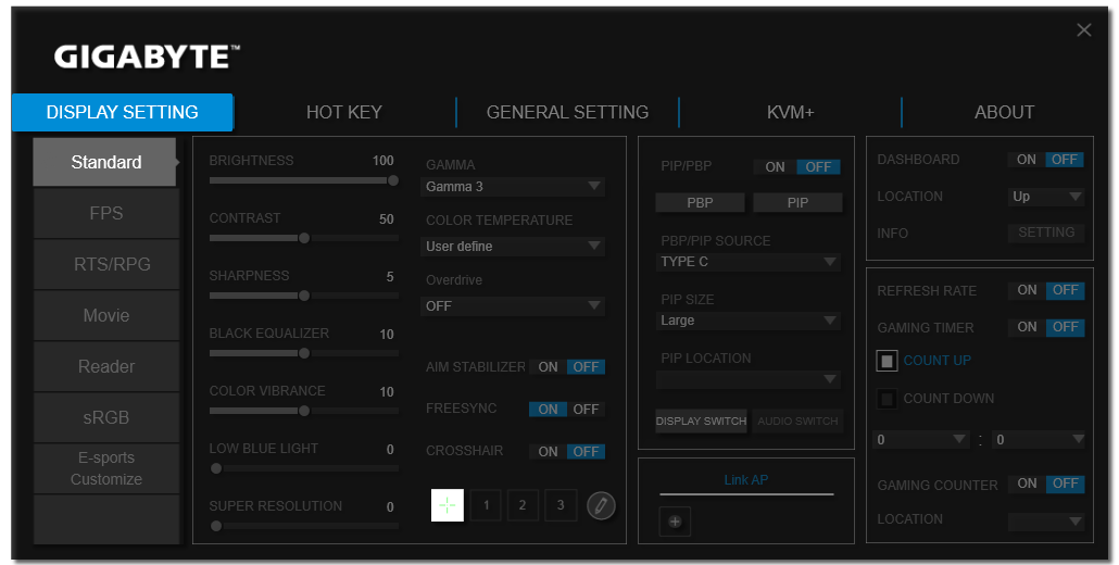 Монитором можно управлять с ПК с помощью фирменного ПО OSD Sidekick. Кроме настроек, доступных из меню монитора, в OSD Sidekick можно сохранять/загружать профили, редактировать форму перекрестия прицела, задавать клавиатурные сокращения, настраивать и переключать KVM и обновлять микропрограмму монитора. Только при запущенной OSD Sidekick на монитор выводятся данные на панель Dashboard. И именно в OSD Sidekick задаются клавиатурные сокращения, которым пользователь может увеличивать и уменьшать значение пользовательского счетчика. Что им полезно будет считать — зависит от игры.
