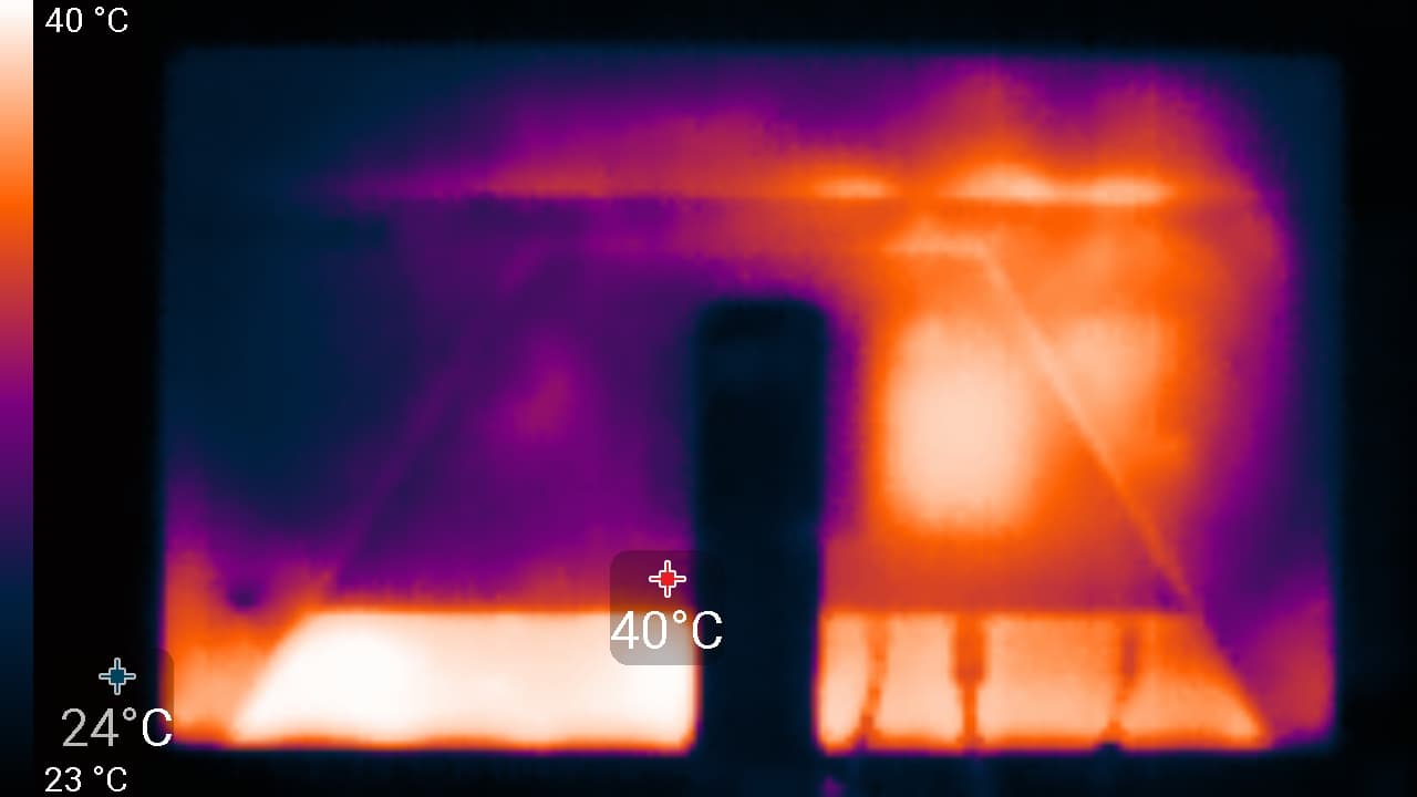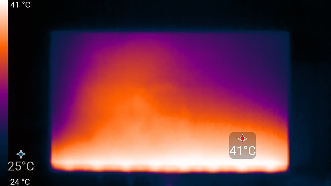 Нагрев монитора можно оценить по приведенному снимку с ИК-камеры, полученному после долговременной работы монитора на максимальной яркости (режим HDR) в помещении с температурой примерно 24 °C: