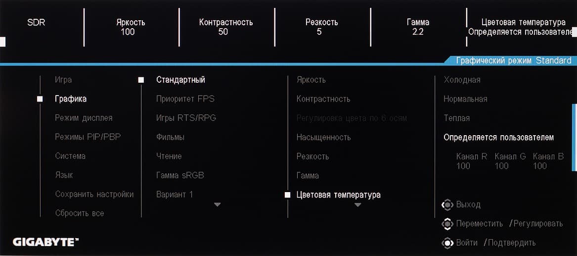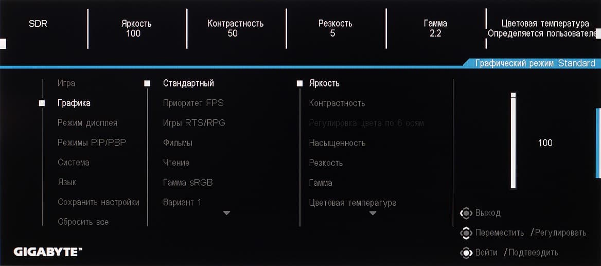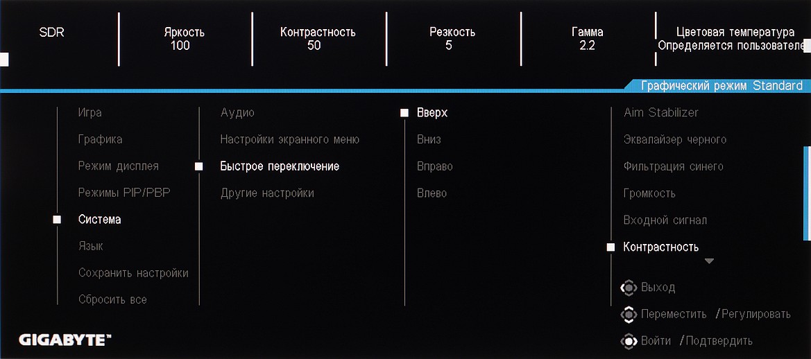 Навигация по меню очень удобная, так как все делается только джойстиком, не нужно переносить палец на кнопки, и количество необходимых действий разумно сокращено, к тому же списки зациклены. При настройке изображения меню остается на экране — это несколько мешает оценке вносимых изменений. При необходимости можно установить уровень прозрачности фона меню, выбрать тайм-аут автоматического выхода из меню и включить блокировку меню, что предотвращает случайное изменение настроек. Есть русская версия экранного меню. Качество перевода на русский язык среднее, есть ошибки и неточности, поэтому в тексте мы местами используем английские названия настроек. Напечатанной документации в комплекте поставки — самый минимум. Полные руководства пользователя в виде PDF-файлов можно найти на сайте Gigabyte.