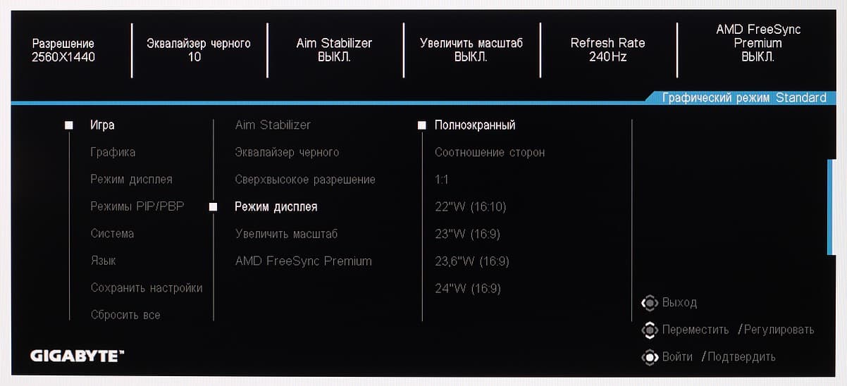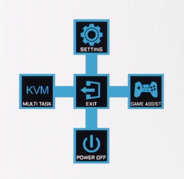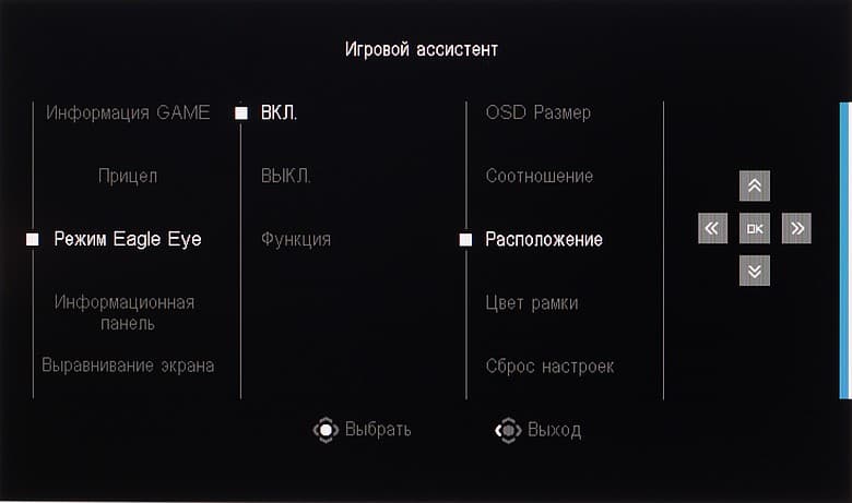 Если на экране оно, то нажатие на джойстик — выход из меню, отклонение вниз — выключение монитора (его можно выключить и без меню длительным нажатием на джойстик), вверх — вход в основное меню установок, вправо — меню с настройками игровых функций, влево — меню KVM.
