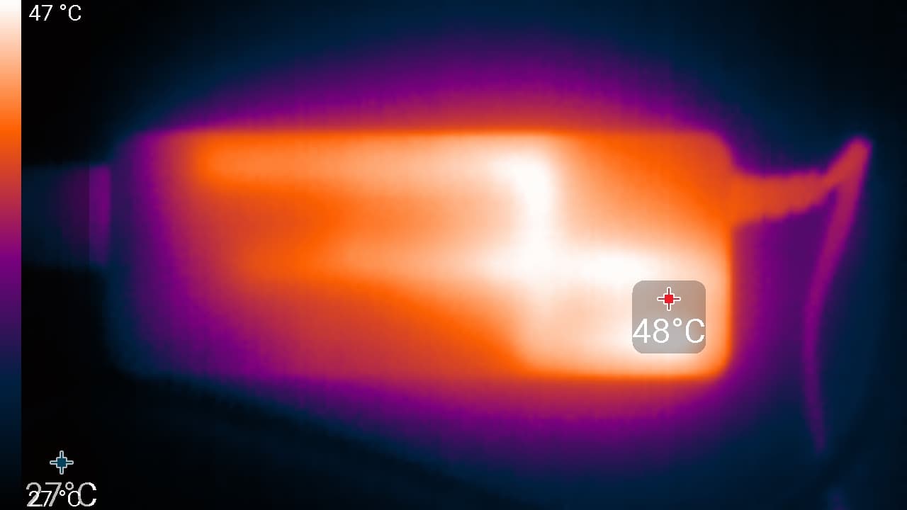 Нагрев сзади умеренный. Корпус БП нагрелся до 48 °C, что довольно много: