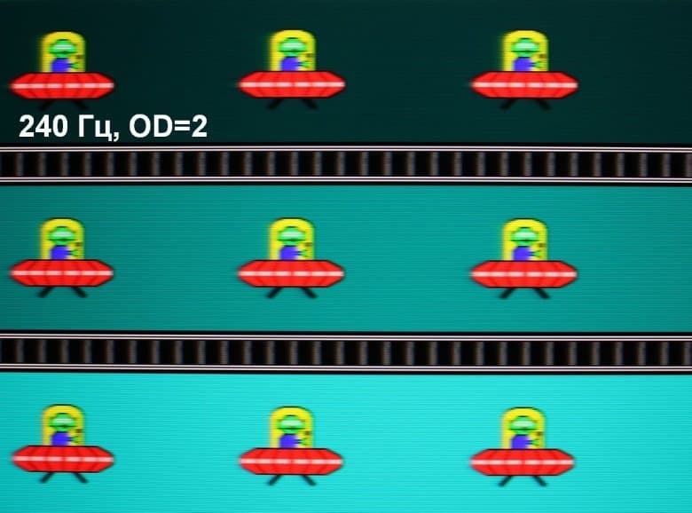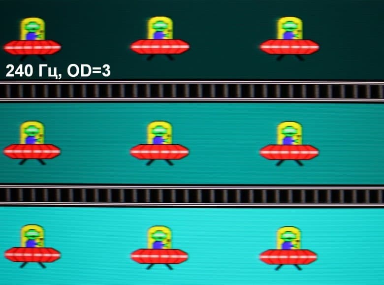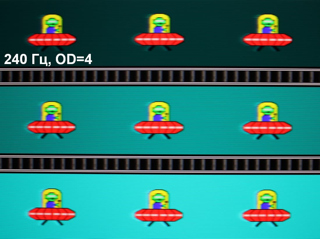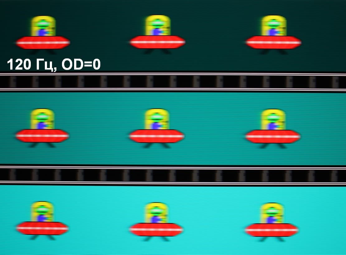 Видно, что при прочих равных условиях четкость изображения повышается по мере роста частоты обновления и степени разгона, но на максимальном разгоне артефакты уже очень заметные. Включение Aim Stabilizer Sync увеличивает четкость вплоть до одного пикселя по горизонтали, но объекты в движении троятся, что снижает положительный эффект. В этом режиме, видимо, можно обойтись без разгона матрицы.
