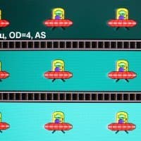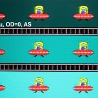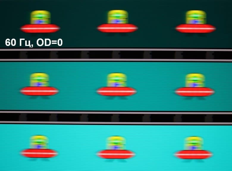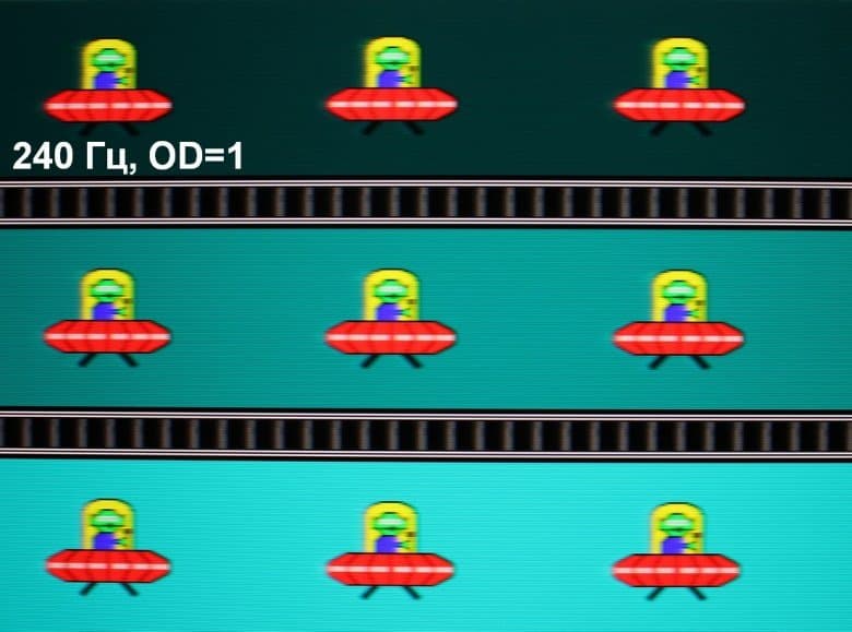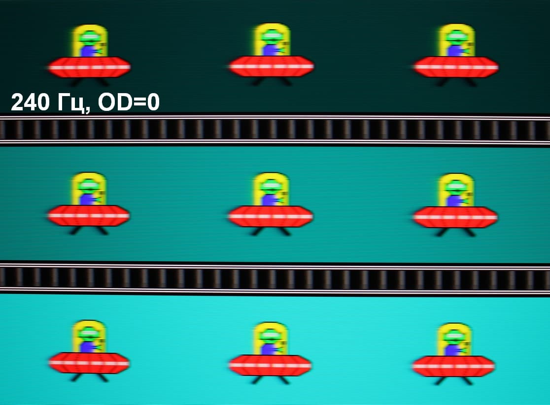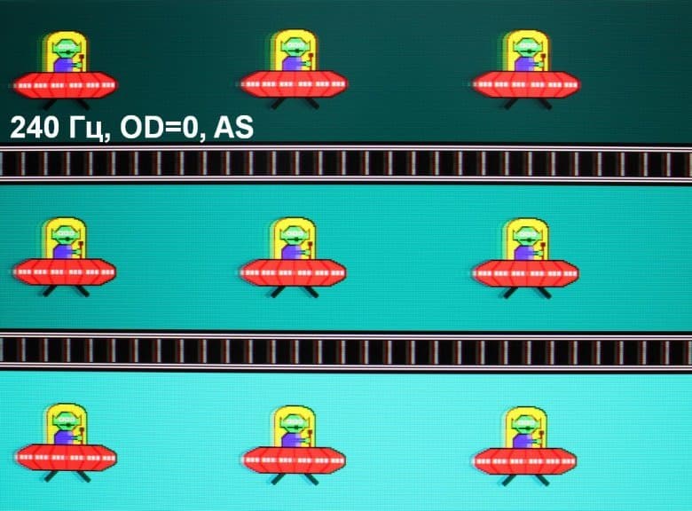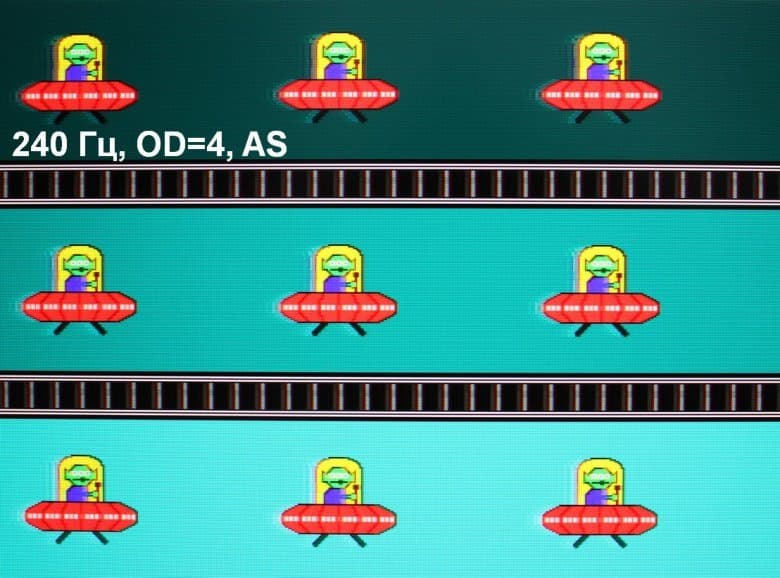 Для наглядного представления о том, что на практике означает такая скорость матрицы, какие могут быть артефакты от разгона и повышает ли четкость в движении, описанная выше настройка Aim Stabilizer Sync, приведем серию снимков, полученных с помощью движущейся камеры. Такие снимки показывают, что видит человек, если он следит глазами за двигающимся на экране объектом. Описание теста приведено тут, страница с самим тестом тут. Использовались рекомендованные установки (скорость движения 960 пиксель/с для частот обновления 60, 120 и 240 Гц), выдержка 1/15 с, на фотографиях указаны значения частоты обновления, а также ступень разгона (OD=x) и включен ли режим Aim Stabilizer Sync (AS).