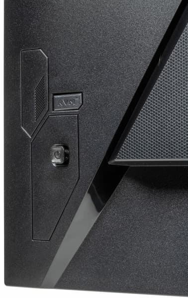 В целом дизайн умеренно игровой, поэтому с точки зрения внешнего вида монитор можно считать универсальным. Панели монитора и кожухи подставки изготовлены из черного пластика в основном с просто матовой поверхностью, но местами есть мелкий рельефный узор и глянцевые участки.